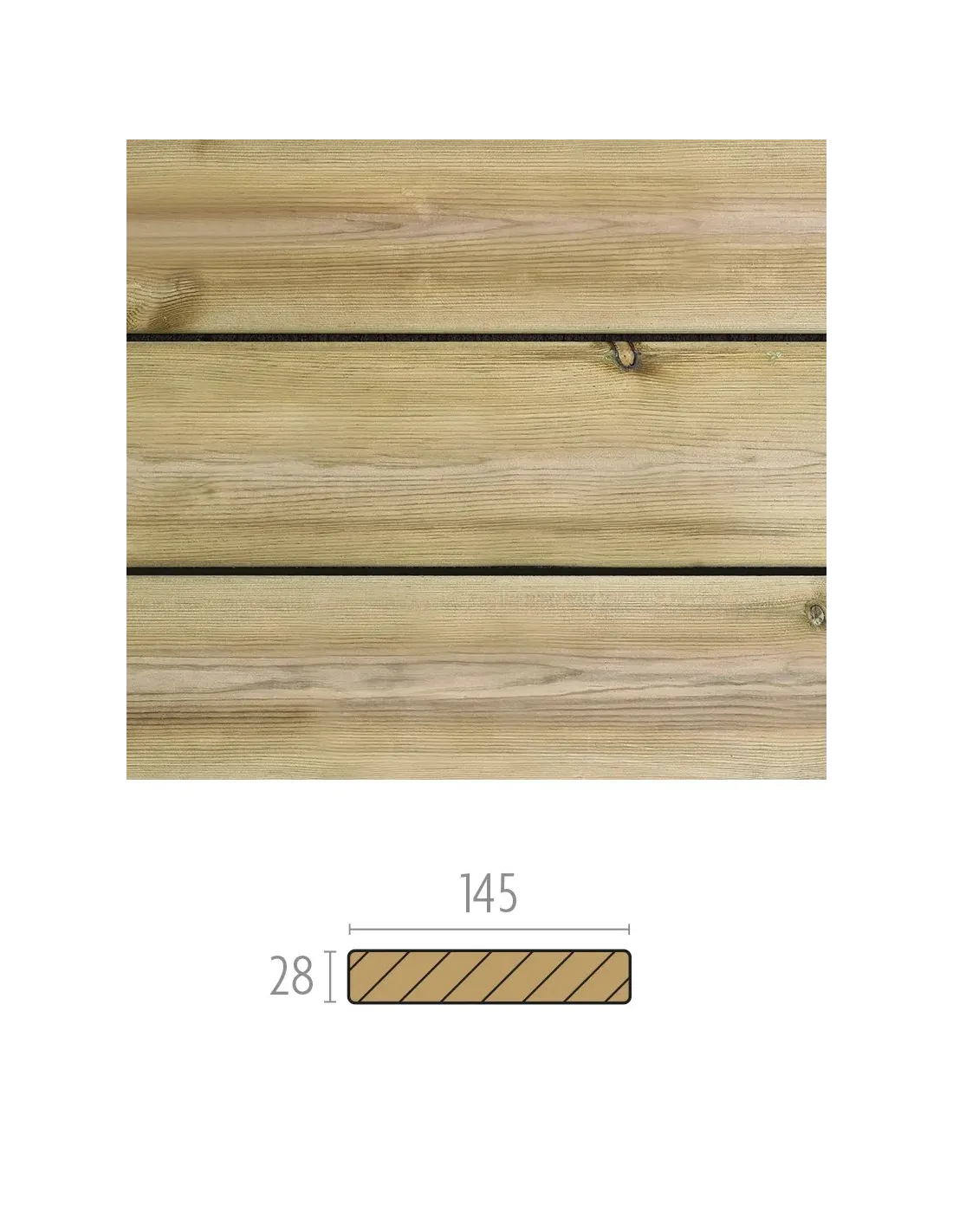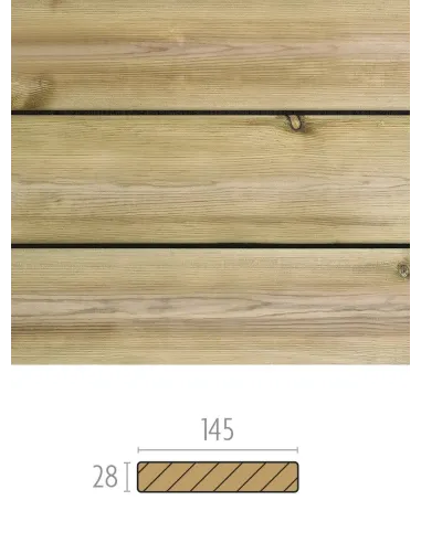 Planche de terrasse en Pin Traité lisse 28x145 mm avec ou sans vis et chevrons (prix/m2).