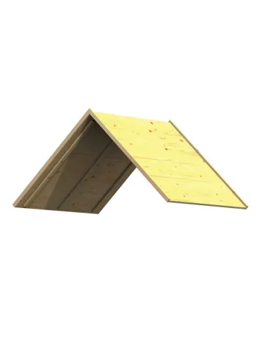 Le toit en bois de la tour de base de portique de balançoire est livré en kit pré-monté. Les planches du toit ont une épaisseur de 16 mm. Pour prolonger sa durée de vie, recouvrez le toit en bois de bardeaux bitumés par exemple (env. 2,5 m² nécessaires). Compatible avec le toit en bois, vous trouverez le kit fronton en bois résineux.