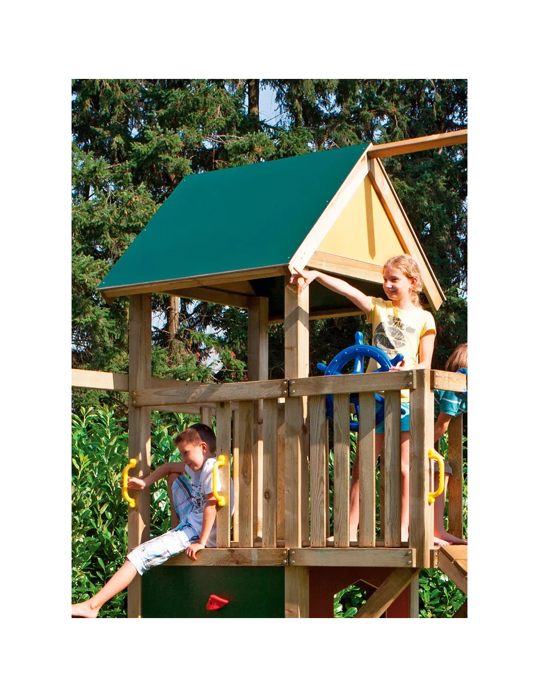 Le toit facile d’entretien pour la tour de jeux est fabriqué en bouleau lamellé-collé. Les surfaces sont lisses et revêtues en couleur. La lasure utilisée est spécialement pour les jeux d’enfants et sans danger pour l’environnement. La couleur intensive à la livraison va s’atténuer sous l’effet du rayonnement UV. Un revêtement de toiture supplémentaire n’est pas nécessaire. Le kit de frontons jaunes est assorti au toit vert.