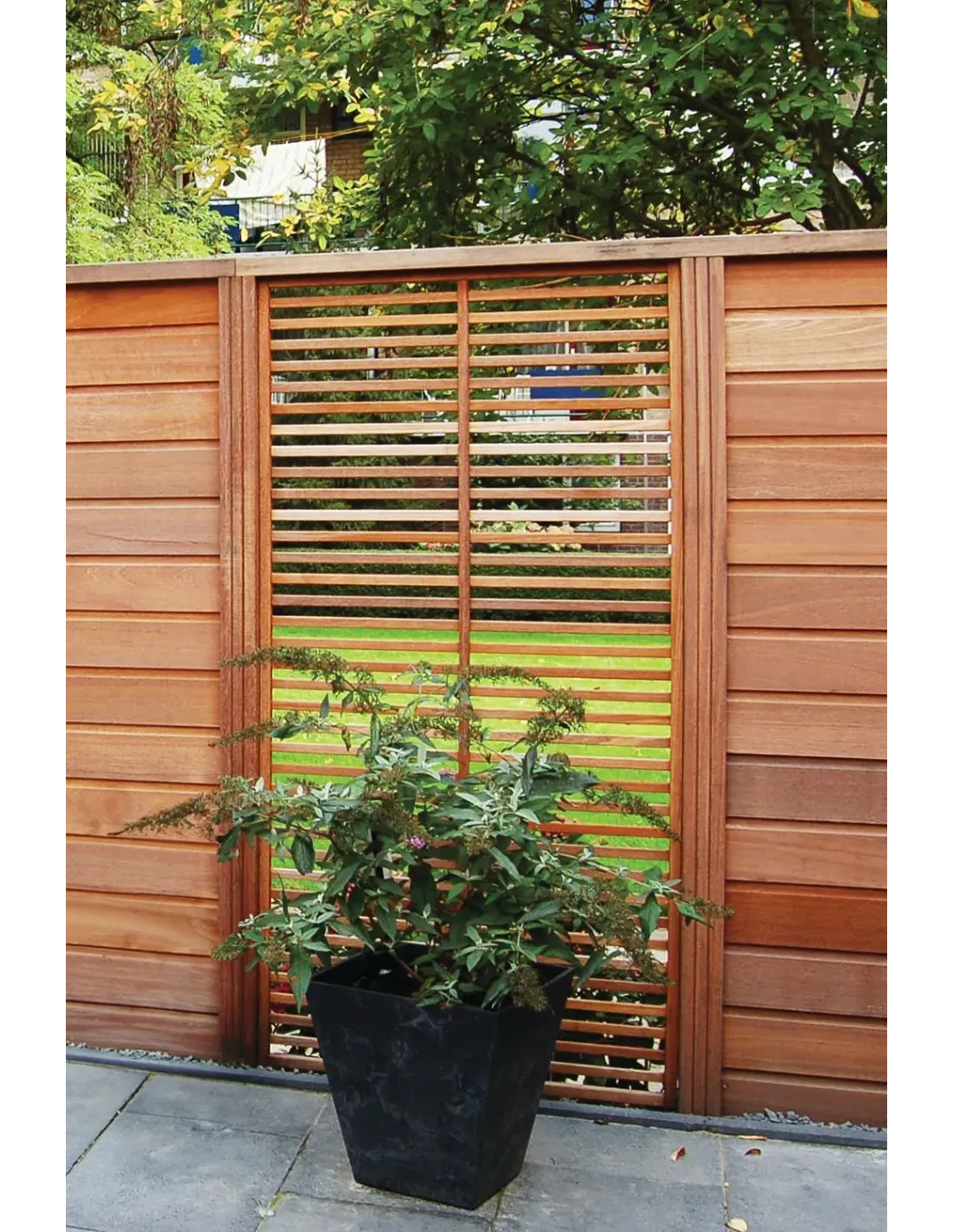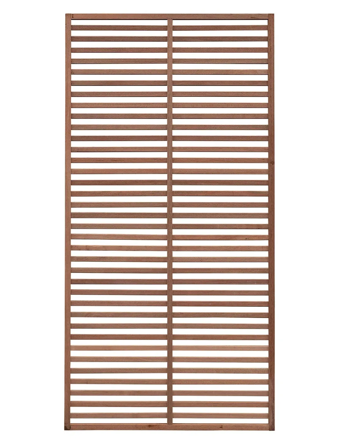 Het persienneachtige rasterwerk uit de Rio-serie wordt aangeboden met Amerikaanse lamellen van Bangkirai 8 x 25 mm en een hoogte van 180 cm, omlijst met een rand van 25 x 25 mm.