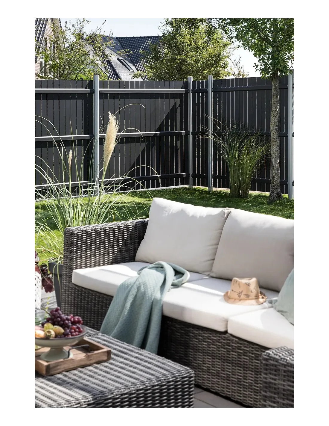 Verticale opengewerkte latten bieden een mooi evenwicht tussen privacy en visuele lichtheid. De beschikbare kleuren (antraciet en zilver) passen bij uiteenlopende architecturale stijlen.