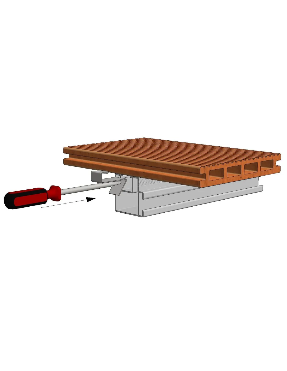 Let op doe dit voorzichtig en duw altijd de klem in de hoek sturend omhoog. Als het eerste terrasdeel gemonteerd is, zet men eenvoudig de klemmen op het profiel.