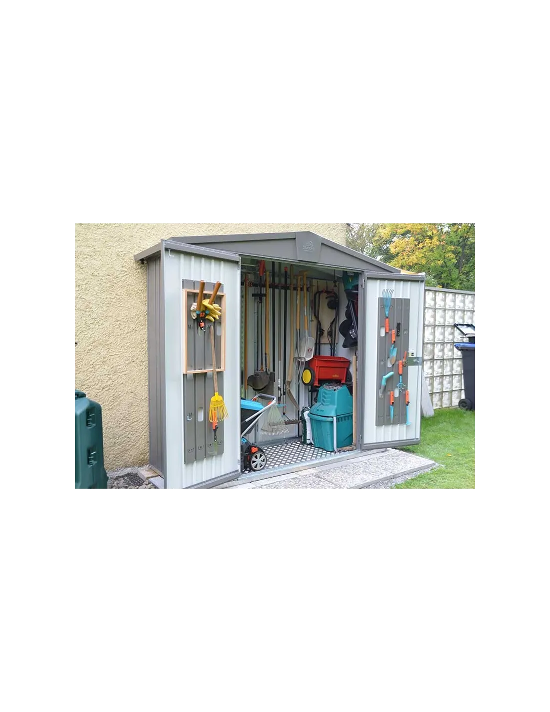 - 4 gereedschaphouders (voor het ophangen van spades, rieken, slangen etc.)