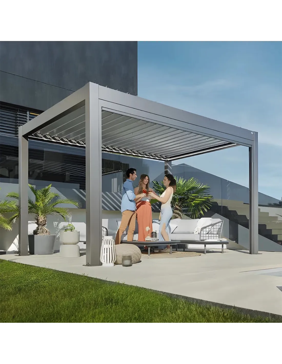 Verkrijgbaar in verschillende afmetingen, past de pergola naadloos in elke ruimte. De kwartsgrijs metallic kleur geeft het een eigentijdse en tijdloze uitstraling.
