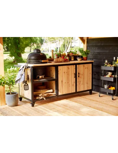 Ontdek ons buitenkeukenmeubel van staal en Douglas, dat functionaliteit en design combineert om uw buitenruimte te verfraaien. Dit meubelstuk is onbehandeld om de natuurlijke schoonheid van het hout te behouden en is ontworpen met kwaliteitsmaterialen, waarbij hout en staal worden gecombineerd. Het bevat een magneetsluiting, praktische handgrepen en draaibare wielen. Met afmetingen van 88 cm hoogte, 190 cm lengte en 57 cm breedte, is het robuust en weegt het 50 kg. Flexibel en gemakkelijk te monteren, maakt het mogelijk om het gebruik aan te passen aan het type grill. Dit meubel zal nieuwe normen stellen voor uw buitenkookervaringen.