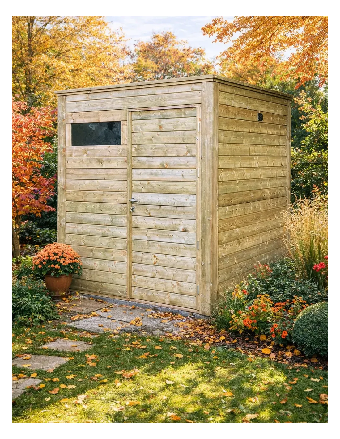 Vergeet lekkages. Dit tuinhuis is uitgerust met een EPDM-dak, een rubberen bedekking die ultrabestendig is tegen UV-straling en weersinvloeden, aangevuld met een geïntegreerd gootsysteem voor een perfecte regenwaterafvoer.