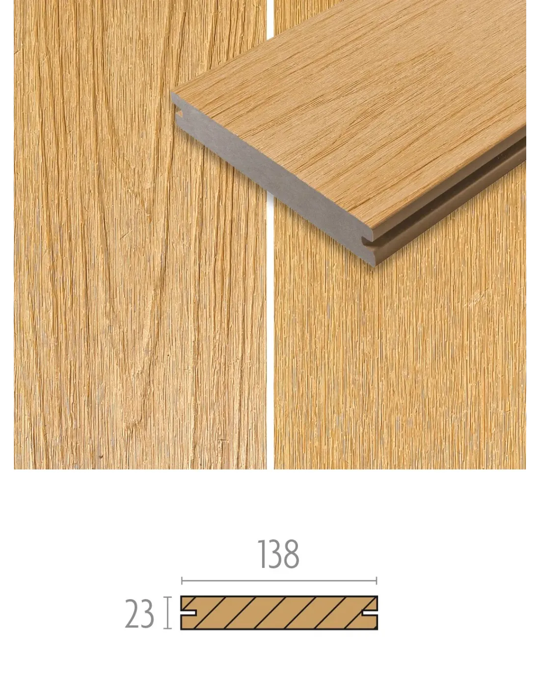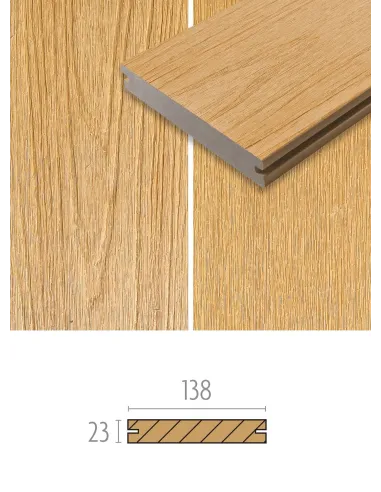 De terrasplanken in cederhoutcomposiet hebben twee kanten; de ene kant is licht gestructureerd met vezelige lijnen en in de richting van het hout, de andere kant imiteert perfect de structuur van een klassiek, natuurlijk hout. De planken zijn bevestigd met Cobra hybride clips. De planken meten 23 x 138 mm en zijn 4 meter lang. Ze zijn verkrijgbaar in de kleur Cedar.