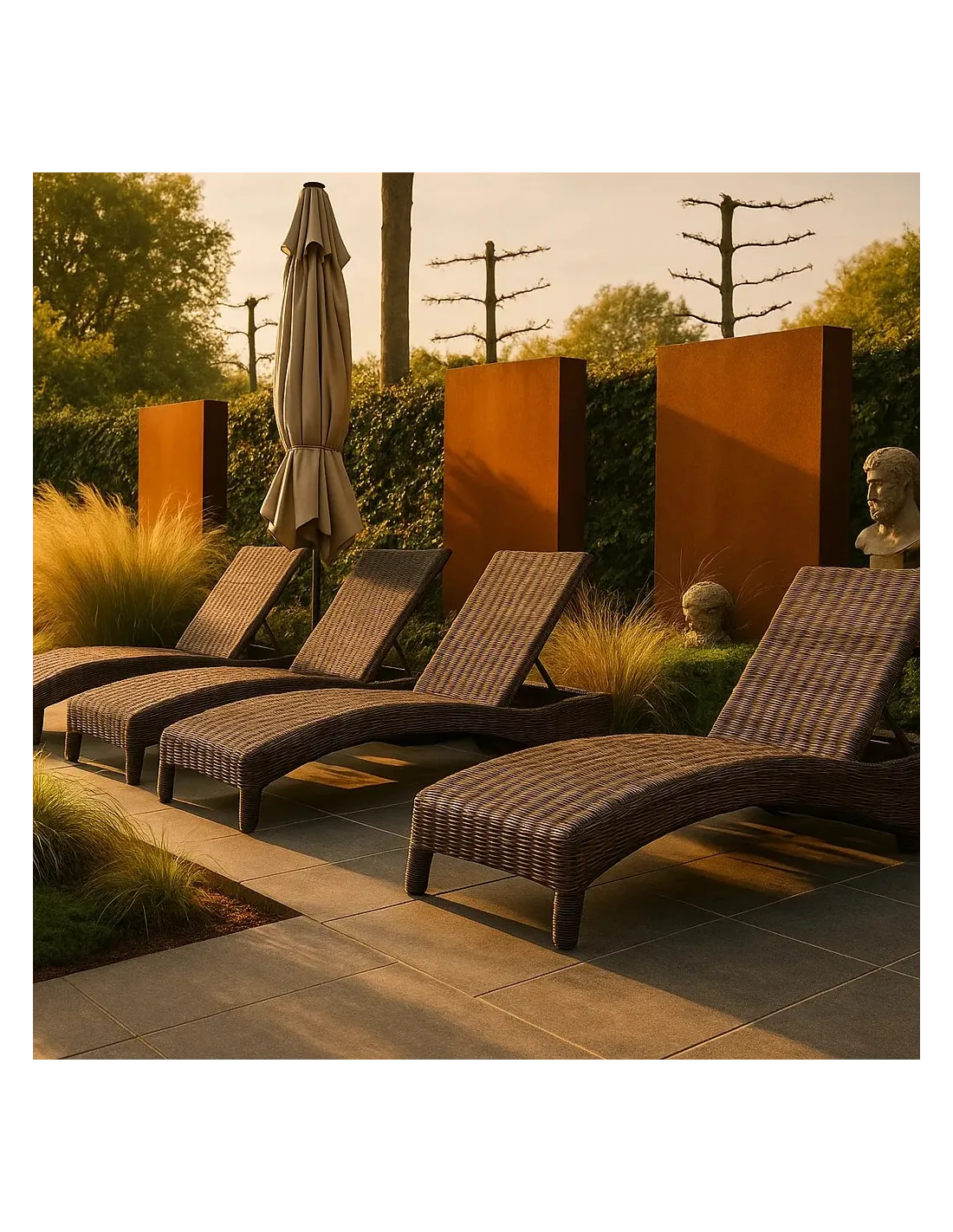De Cortenstalen muur ontwikkelt een beschermende roestpatina, wat het materiaal een warme, evoluerende en zeer eigentijdse kleur geeft. Het past perfect in een moderne tuin en voegt een chique industriële toets toe.