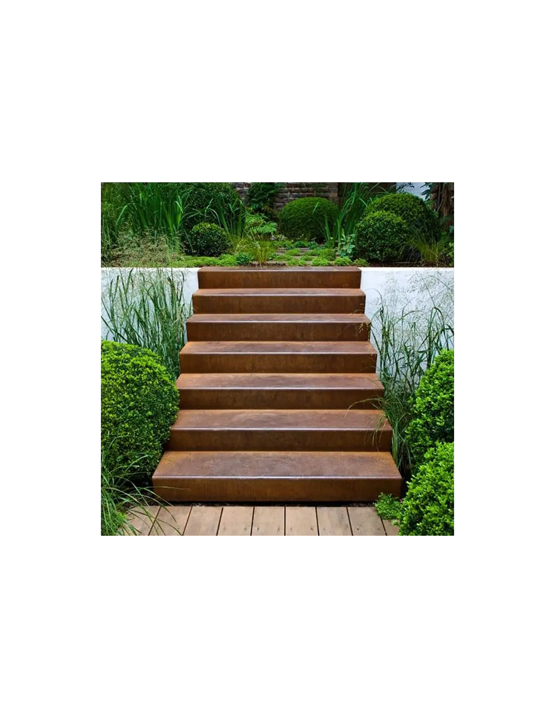 De cortenstalen trap is bijzonder robuust en de natuurlijke oranjebruine kleur geeft hem een luxueuze en tijdloze uitstraling. Als u de trap combineert met andere cortenstalen elementen in uw tuin, krijgt hij een nog opvallender effect. De natuurlijke kleur van cortenstaal wordt verkregen door een beschermende roestlaag die zich in de loop der tijd op natuurlijke wijze vormt. Cortenstaal is bovendien weerbestendig, wat een lange levensduur van uw trap garandeert.