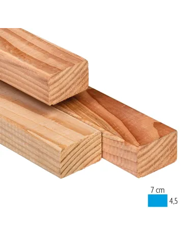 Lambourdes en chevrons van Frans Douglas, massief hout ideaal voor buitentoepassingen (terrassen, pergola's, dakconstructies). Houtsoort: Douglas (Douglasden of Oregon Pine), herkomst: Frankrijk. Lengtes: 300 of 400 cm; sectie: 45 x 70 mm. Duurzaamheidsklasse: Natuurlijk Klasse 3, rotbestendig zonder chemische behandeling, bestand tegen vocht, insecten en schimmels. Verkrijgbaar in ruwe gezaagde versie (structureel) of geschaafd aan 4 zijden (afwerking). Voordelen: eco-vriendelijk hout uit duurzaam beheerde Franse bossen, uitstekende dimensionale stabiliteit, natuurlijke roze tint. Toepassingen: geschroefde houten terrassen, regelbare dragers of betonblokken, houten constructies, pergola's, carports, overkappingen.