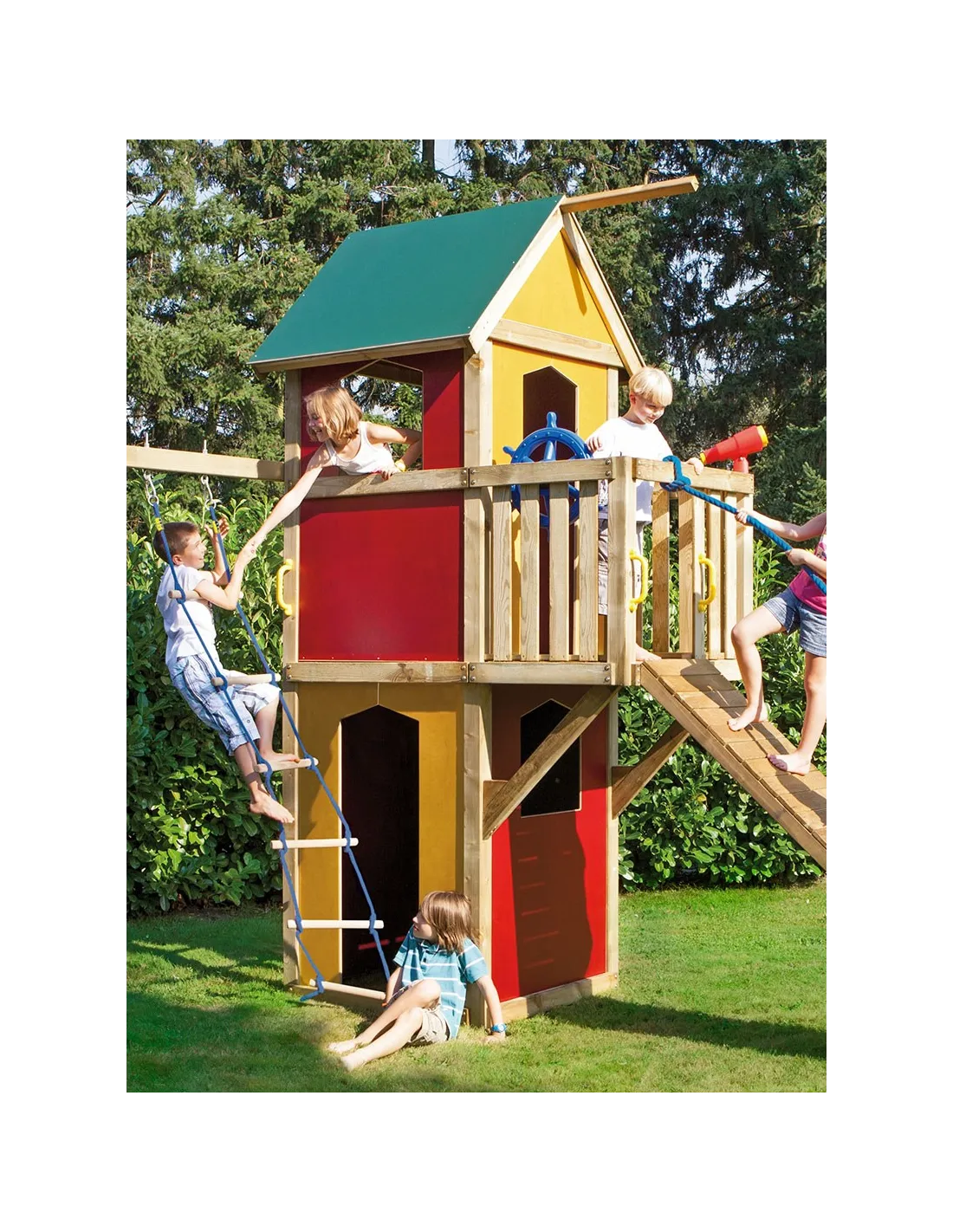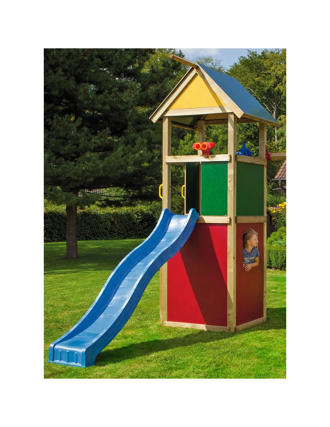 De onderhoudsvriendelijke gevelset is gemaakt van gelijmd berkenhout met gladde, in kleur gecoate oppervlakken. De gele multiplex panelen passen bij het groene, onderhoudsvriendelijke WINNETOO dak en de klassieke houtdach. De gebruikte verf is geschikt voor kinderspeeltoestellen en is zeer milieuvriendelijk. De sterke kleurintensiteit in de afleveringstoestand wordt enigszins verzacht door UV-straling.