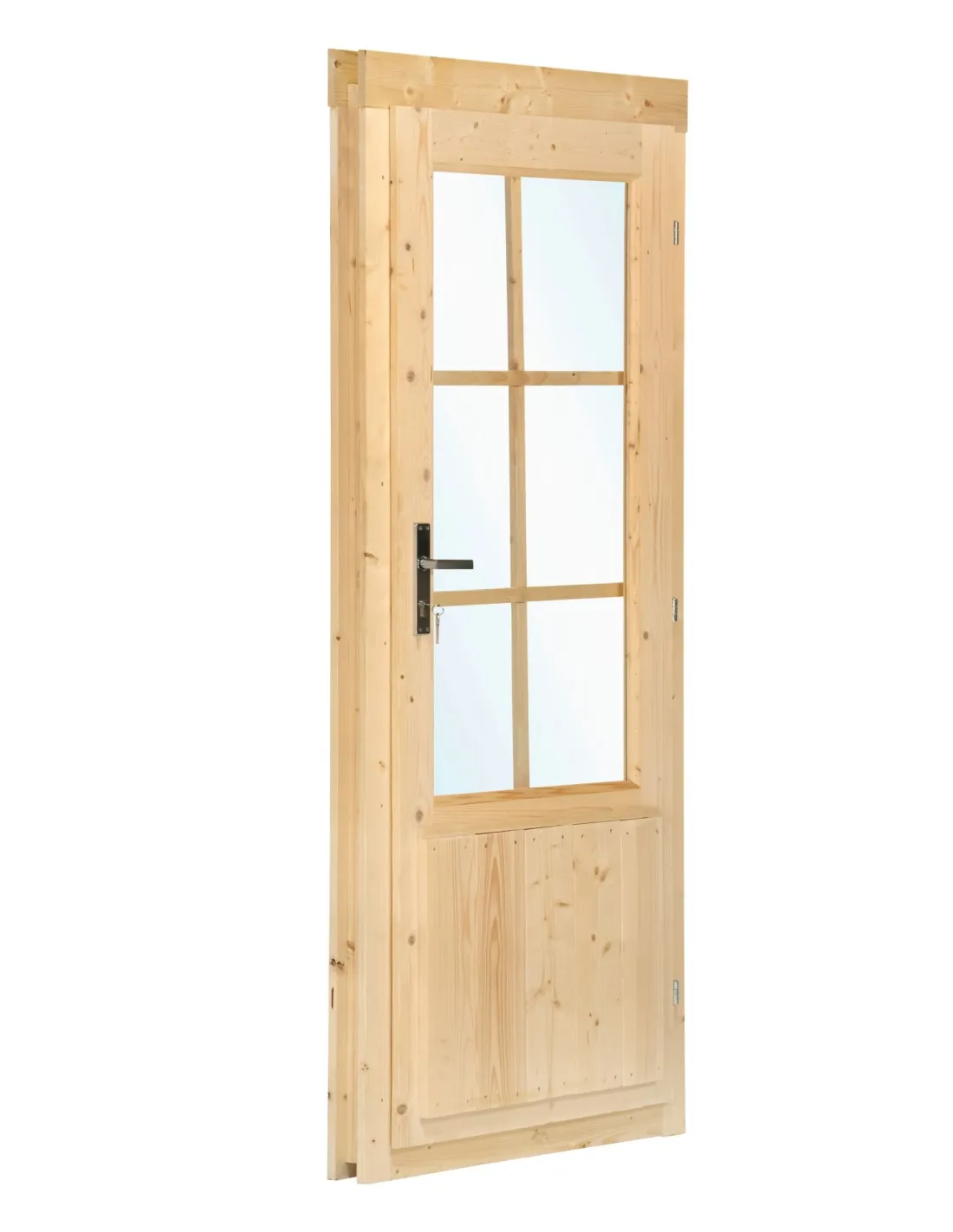 Deze glazen deur voor tuinberging laat natuurlijk licht binnen en zorgt voor goede beveiliging dankzij het vergrendelingssysteem. De grenenhouten structuur past perfect in elke buitenomgeving en zorgt voor een natuurlijke en warme uitstraling.