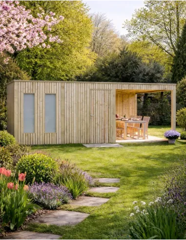 Om perfecte waterdichtheid te garanderen, wordt deze tuinberging met een plat dak en een nokhoogte van 2,35 m geleverd met een ultrabestendige EPDM-folie als dakbedekking. Het pakket bevat ook een regenwatergoot om regenwater gemakkelijk af te voeren en de houten structuur te beschermen.