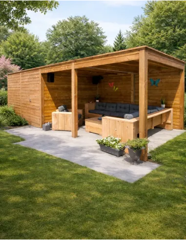 Ontdek onze moderne prieelberging uit de Cubo Premium-reeks. Met royale afmetingen van 8,94 m breedte en 3,18 m diepte is deze buitenoplossing ideaal om een gezellige leefruimte te creëren, een buitenkeuken of een grote, overdekte loungeset voor uw tuin.