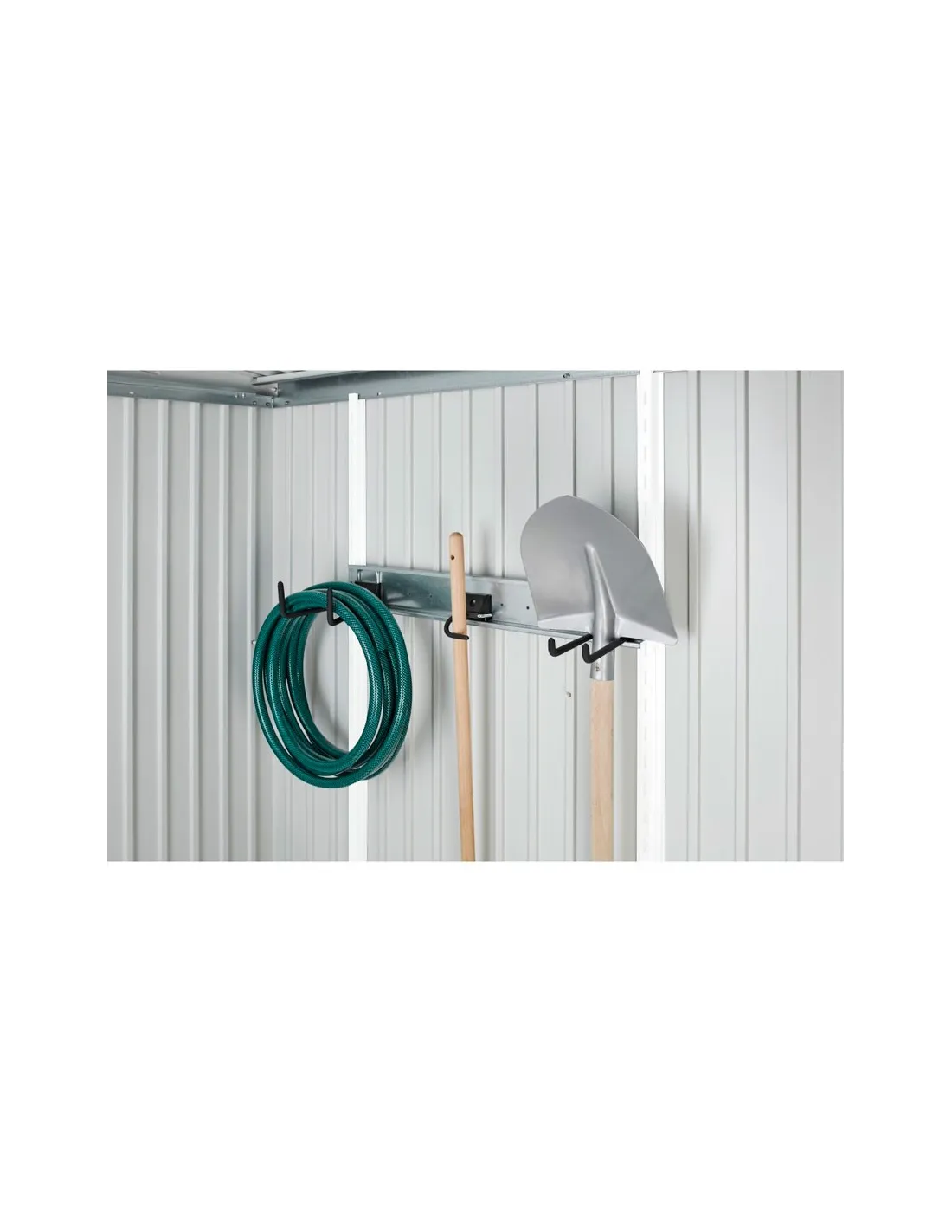 Hakenset bestaande uit een combi-, steel en schephaak en een wandrails die tussen 2 schapstaanders wordt ingehangen.