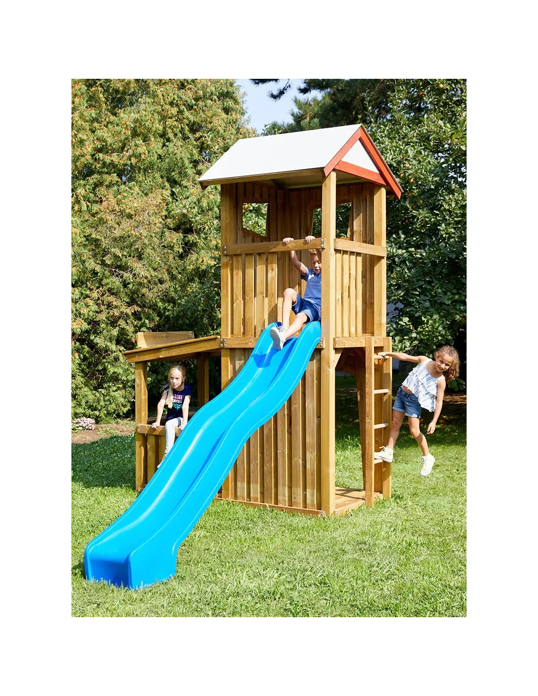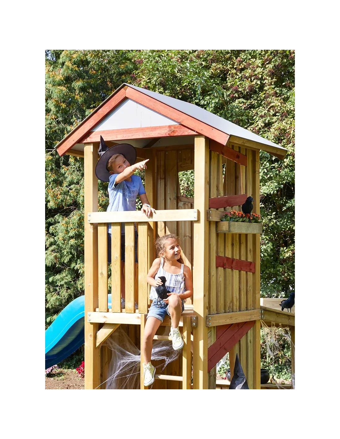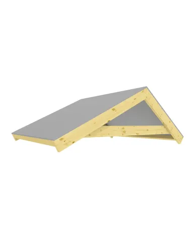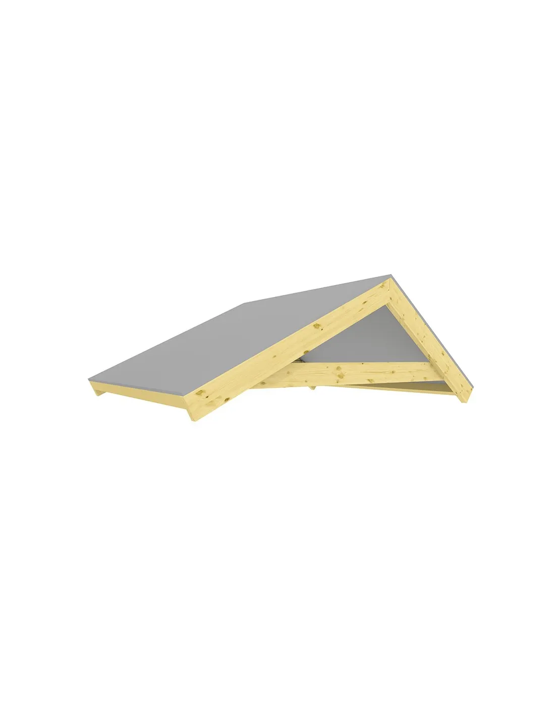 Asymmetrische houten dakconstructie met twee onderhoudsvriendelijke, lichtgrijze HPL-panelen.