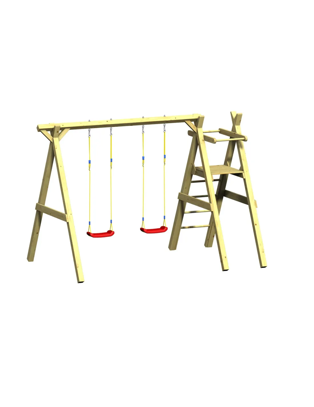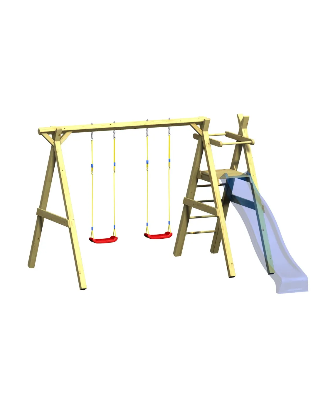 Bied uw kinderen uren speelplezier in de buitenlucht met deze dubbele schommelset met platform voor een glijbaan. Gemaakt van massief naaldhout, bevat het stevige portiek twee comfortabele, duurzame PVC-schommels. Het verhoogde platform maakt het gemakkelijk om een blauwe glijbaan (niet inbegrepen) toe te voegen voor nog meer speelplezier.