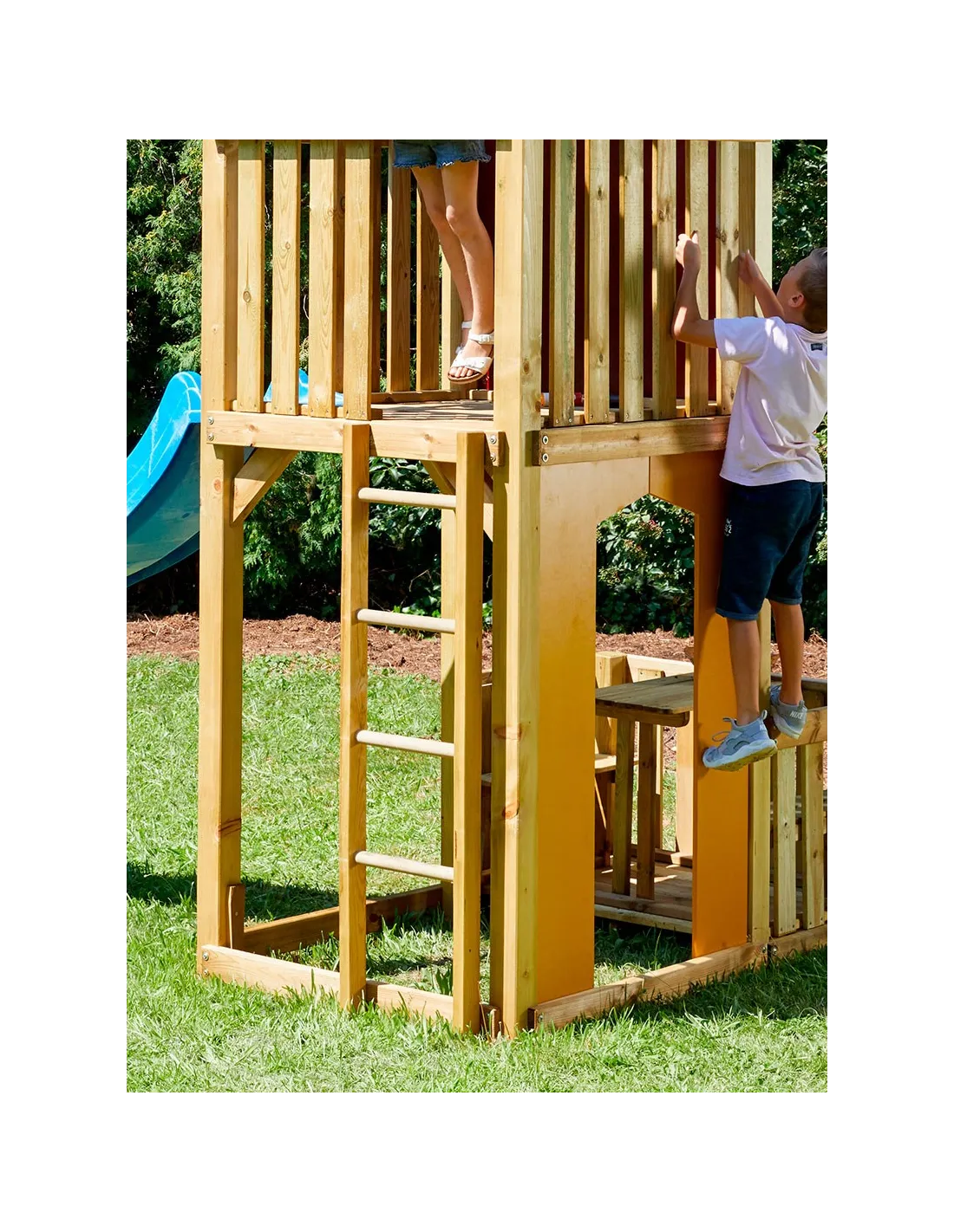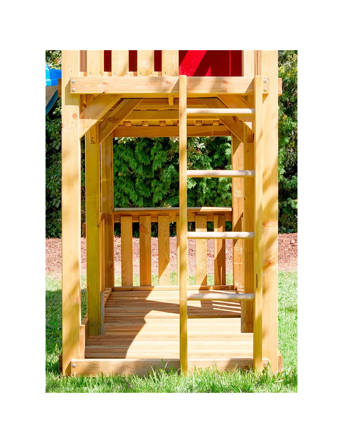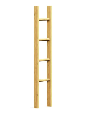 Die houtleiter is in FSC® naaldhout und hat 4 hardhoutsprossen met een diameter van 35 mm. Zur Befestigung im bodembereich benötigen Sie einen zusätzlichen SYSTEEMbalken.