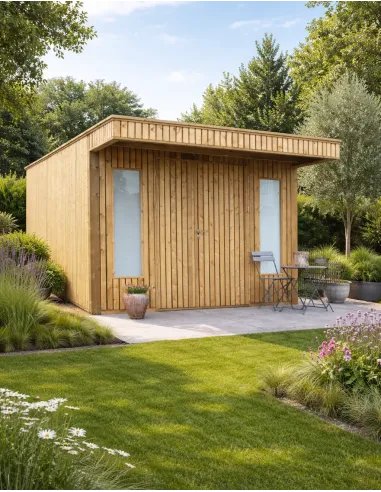 Met zijn comfortabele hoogte van 2,35 m en ruime afmetingen (318 x 624 cm), biedt het u optimale opslagruimte voor uw tuingereedschap, fietsen, of kan het zelfs worden ingericht als een volwaardige extra leefruimte (atelier, poolhouse, enz.).