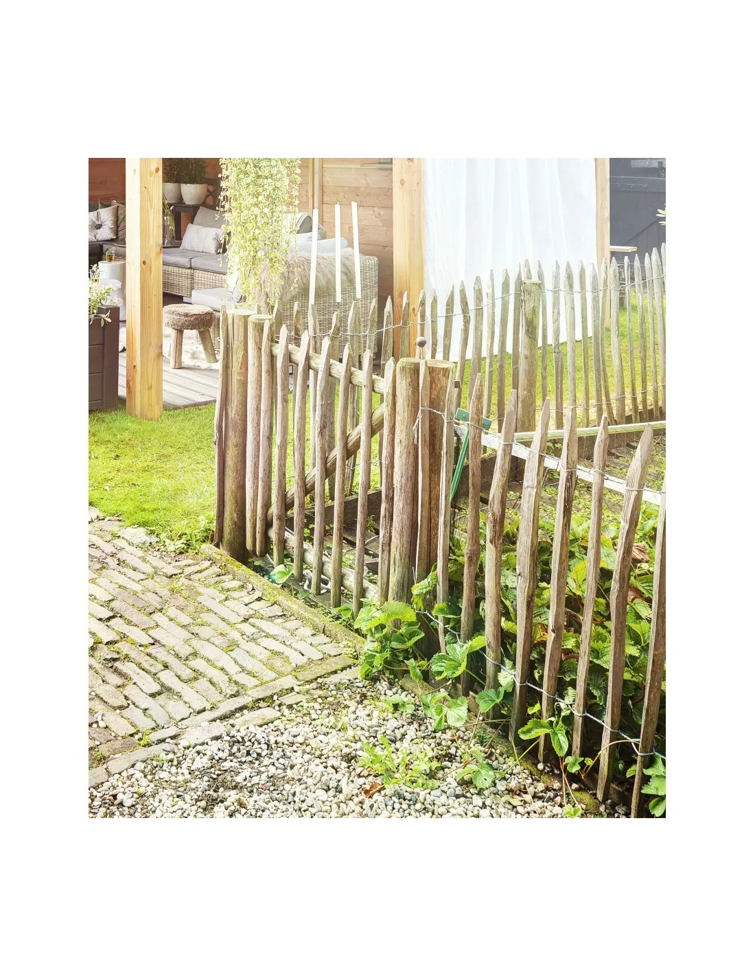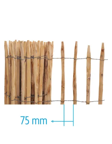 De kastanje hek met een opening tussen de rotbestendig kastanje houten latten van 35 mm of 75 mm en hoogtes van 50 cm, 100 cm, 120 cm, 150 cm of 175 cm. De hekken zijn verkrijgbaar in een rol van 5m of 10m.