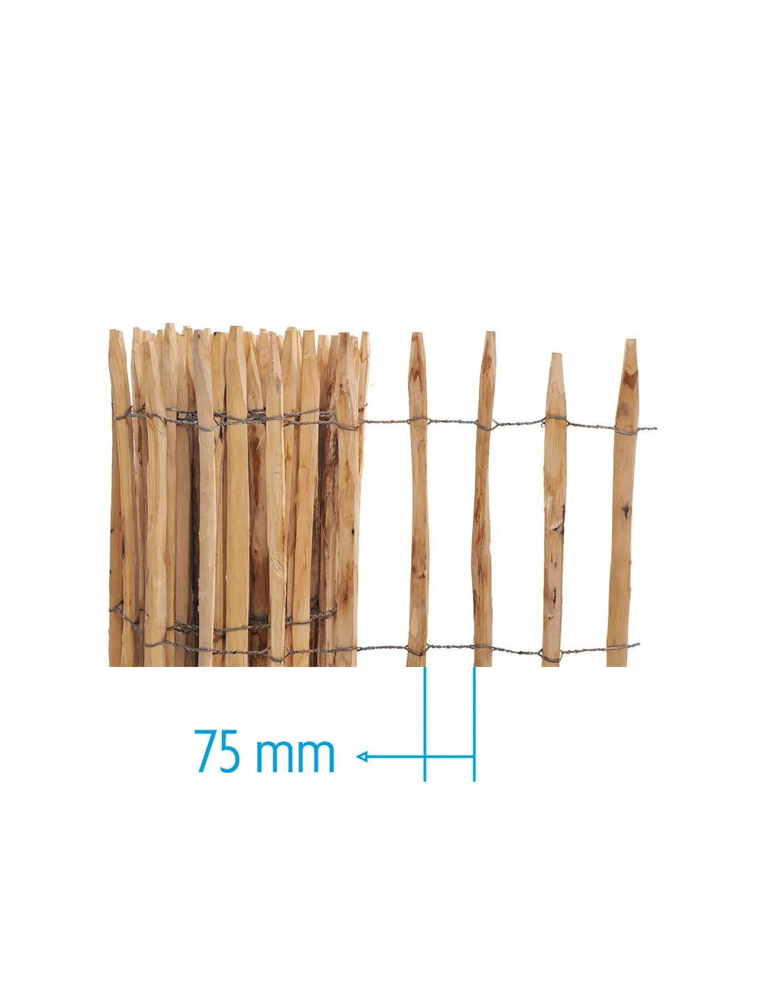 Kastanje tuinafsluiting op rol, hoogte 50 tot 175 cm, tussenruimte 35 of 75 mm. Gespletene puntige latten op gegalvaniseerd draad, onbehandeld, PEFC. Rol van 5 of 10 m.