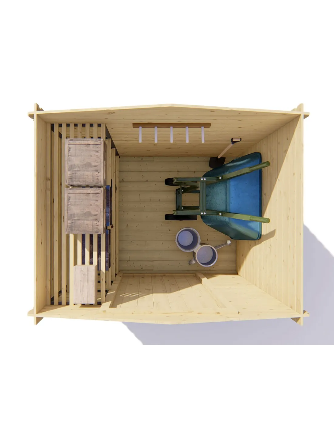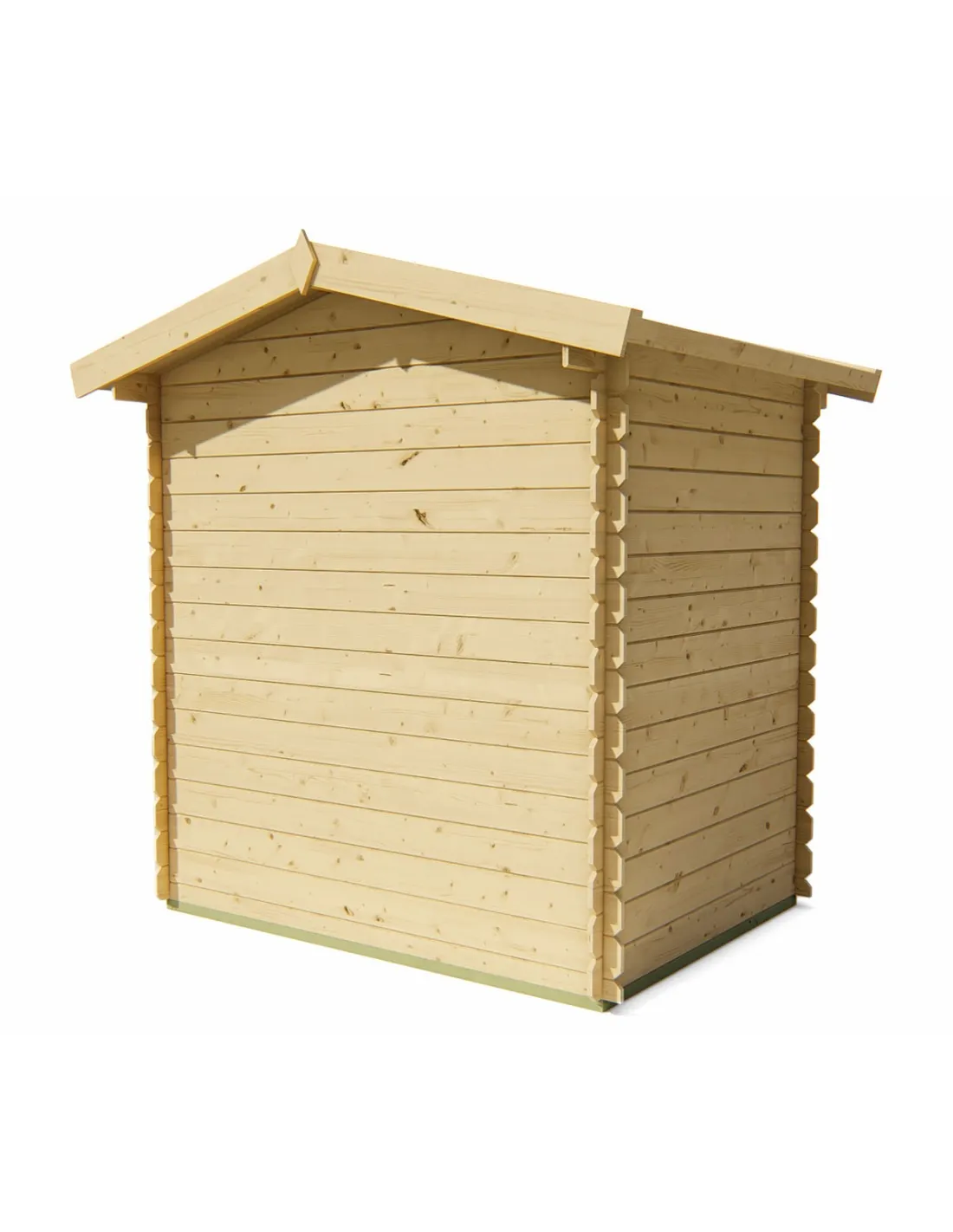 Voorzien van een eenvoudige, dichte deur en zonder ramen, biedt deze houten tuinberging discretie en eenvoud. Dankzij zijn praktische afmetingen – 2,00 m breedte, 1,55 m diepte en 2,17 m hoogte aan de nok – is het een efficiënte oplossing voor kleine ruimtes.