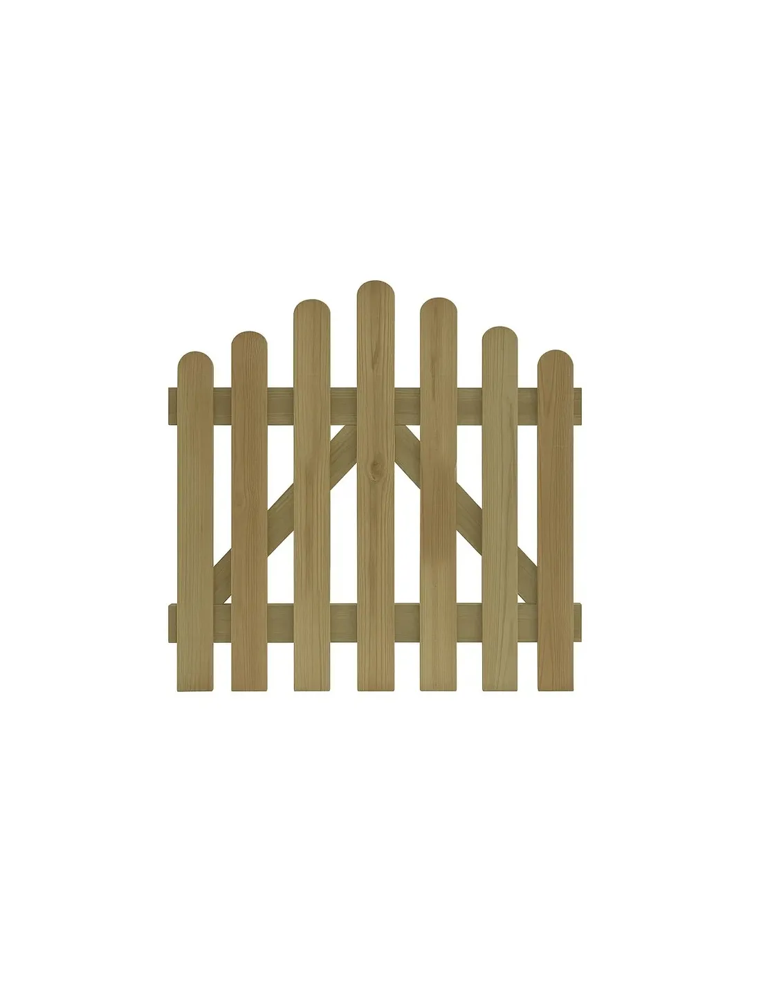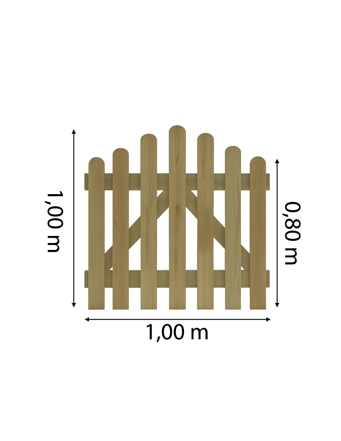 Looppoort van geïmpregneerd vurenhout, weerbestendig en duurzaam. Afmetingen: breedte 1 m, hoogte 0,8 tot 1 m. Klassiek ontwerp met verticale latten en diagonale verstevigingen. Natuurlijke tint die kan worden gepersonaliseerd (verf, beits, vernis). Ideaal voor toegang tot tuin, moestuin of het afbakenen van ruimtes.