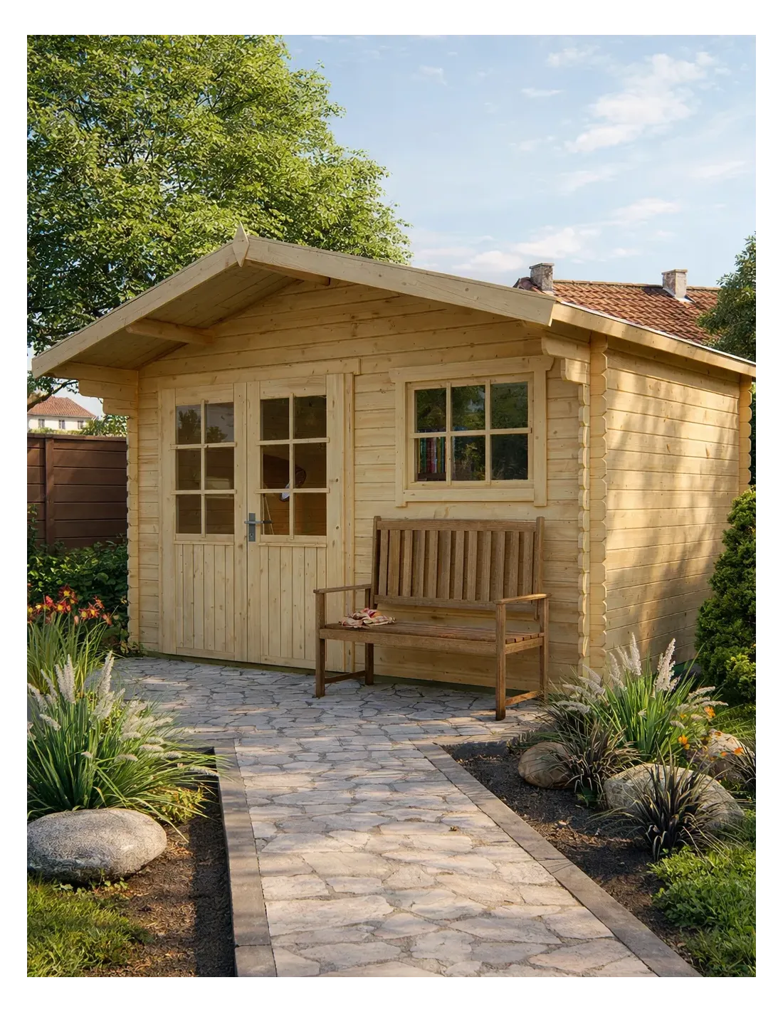 Dit lichtgevende houten chalet is ideaal voor het creëren van een gezellige en functionele ruimte in uw tuin. Het ontwerp met glas maximaliseert de interne helderheid en biedt een elegante en tijdloze stijl.