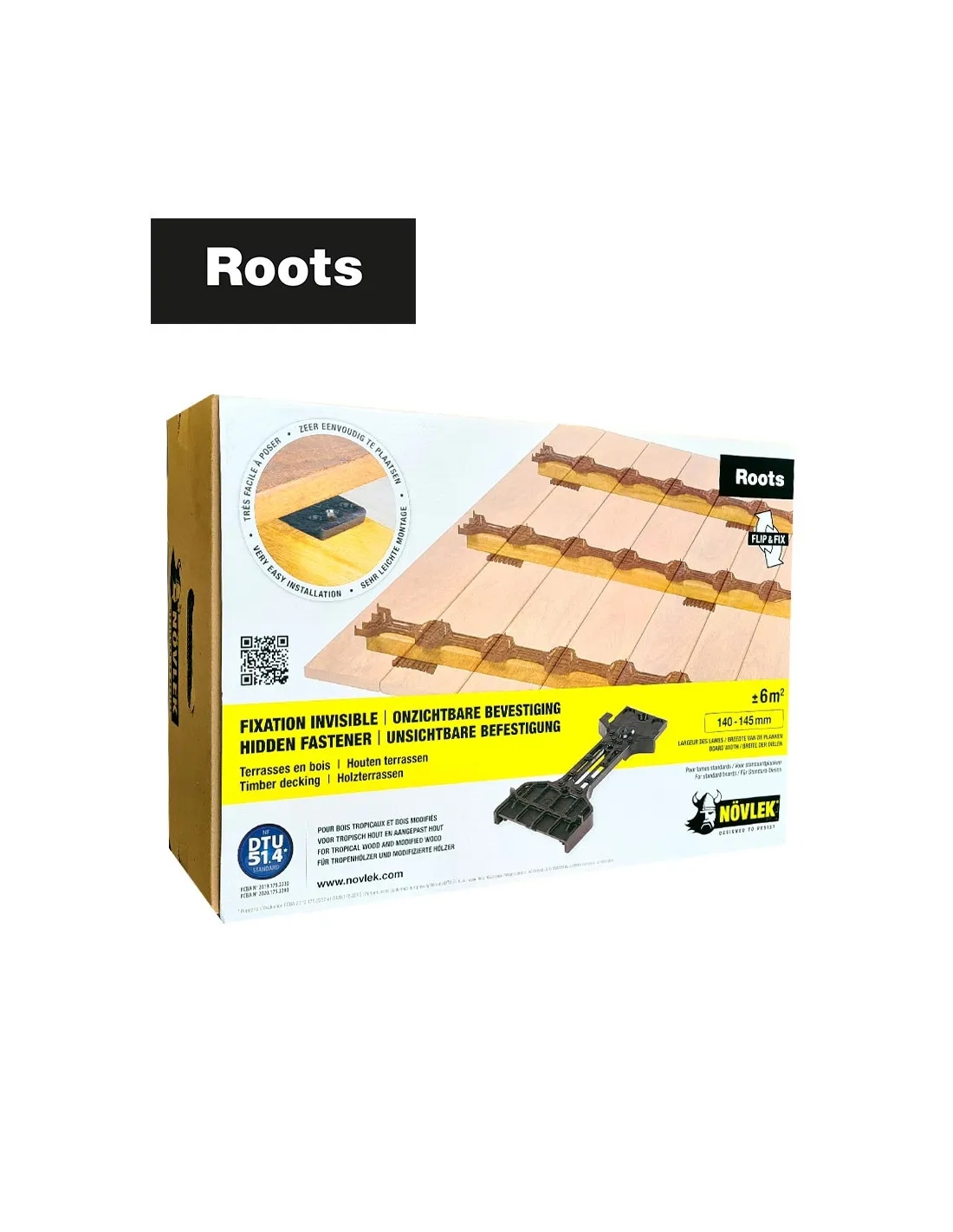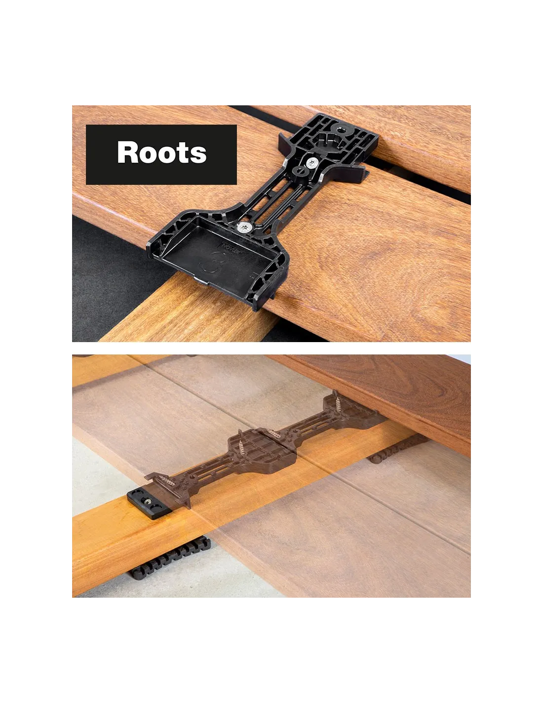 Het onzichtbare bevestigingssysteem Roots zorgt voor een ware revolutie op het vlak van onzichtbare bevestigingen voor houten terrassen. De Roots-bevestiging wordt zonder specifiek profiel aan de onderzijde van standaard terrasplanken geplaatst.