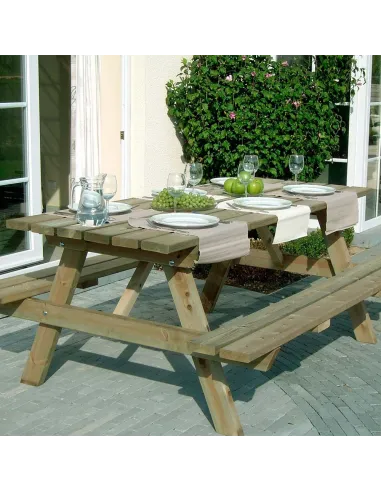 Houten tuintafel met geïntegreerde banken.