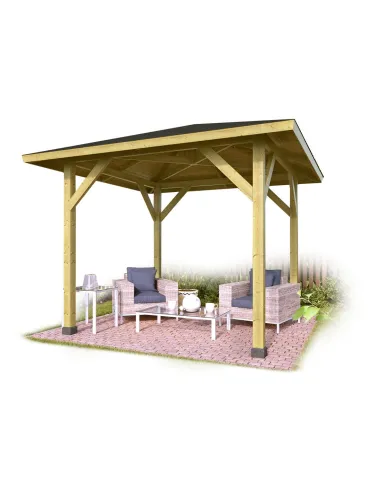 De volledige draagstructuur bestaat uit fijnbezaagde balken 11.5 x 11.5cm en onderdak uit klikplanken 16 mm. Dak in shingels greon, zwart of rood.