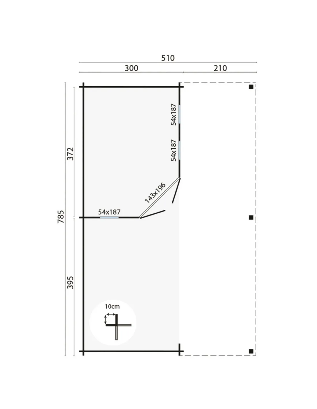Totale afmetingen: 400 + 385 cm (lengte) x 300 + 210 cm (diepte)