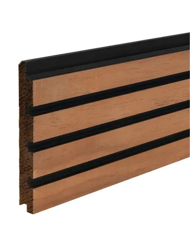 Onze Lines-serie toont een slim ontwerp dat het gewenste uiterlijk van open-voeg bekleding simuleert. Fijne zwarte strepen, nauwkeurig aangebracht in de groeven, creëren een illusie van voegen, waardoor de natuurlijke charme van Radiata hout versterkt wordt terwijl de stevigheid van uw wanden behouden blijft. Dankzij het poreuze hout excelleert de Radiata lambrisering in akoestiek, vermindert echo's voor een rustige en verwelkomende binnenatmosfeer.