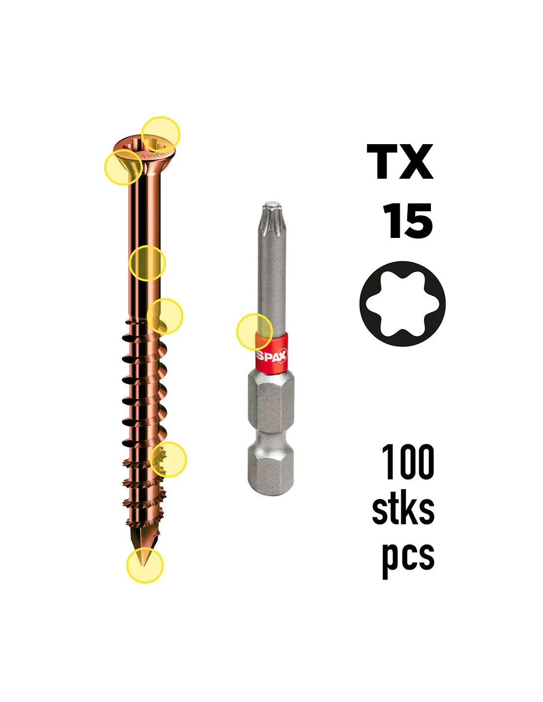 De schroef is speciaal ontworpen voor onzichtbare HardWood Clip® en SoftWood Clip™-bevestigingen voor houten terrassen en gevelbekledingen.