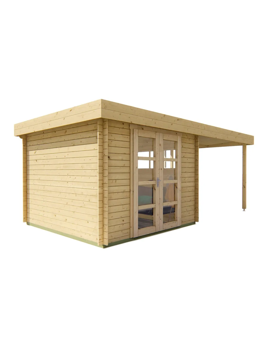 Dit tuinhuis met plat dak is perfect voor wie op zoek is naar een modern, duurzaam en licht buitenverblijf. De stevige massieve houten structuur en de dakbedekking garanderen weerstand en een lange levensduur.
