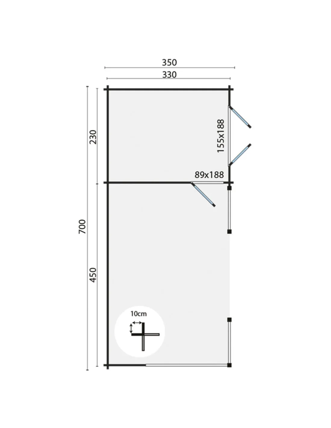 Buitenafmetingen: 250 + 450 x 350 cm (luifel + hut)