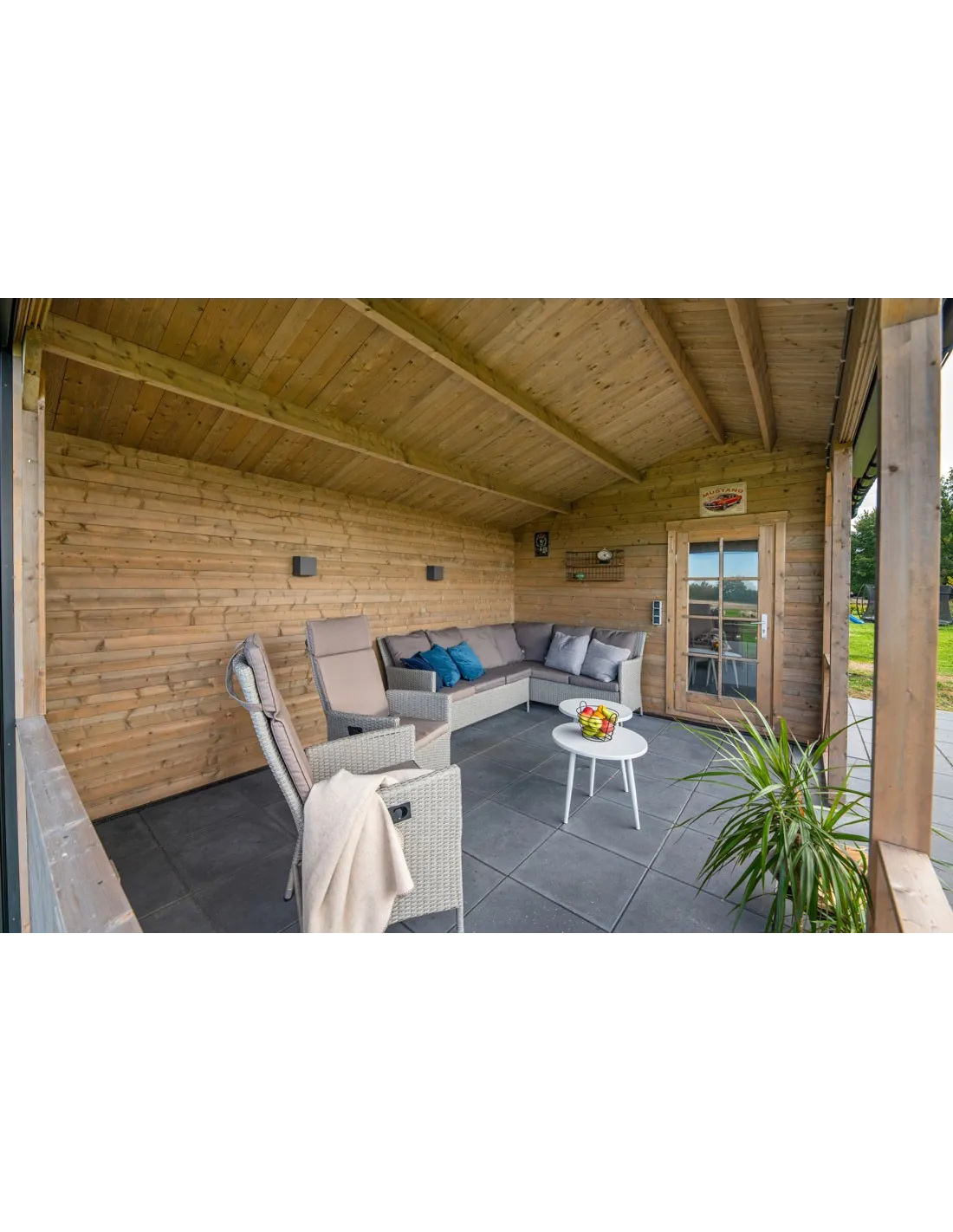 Dit ruime tuinhuis beschikt over een brede overkapping die een overdekt terras vormt, beschermd door elegante balustrades. Perfect om in elk seizoen van uw tuin te genieten, beschut tegen wind en zon.