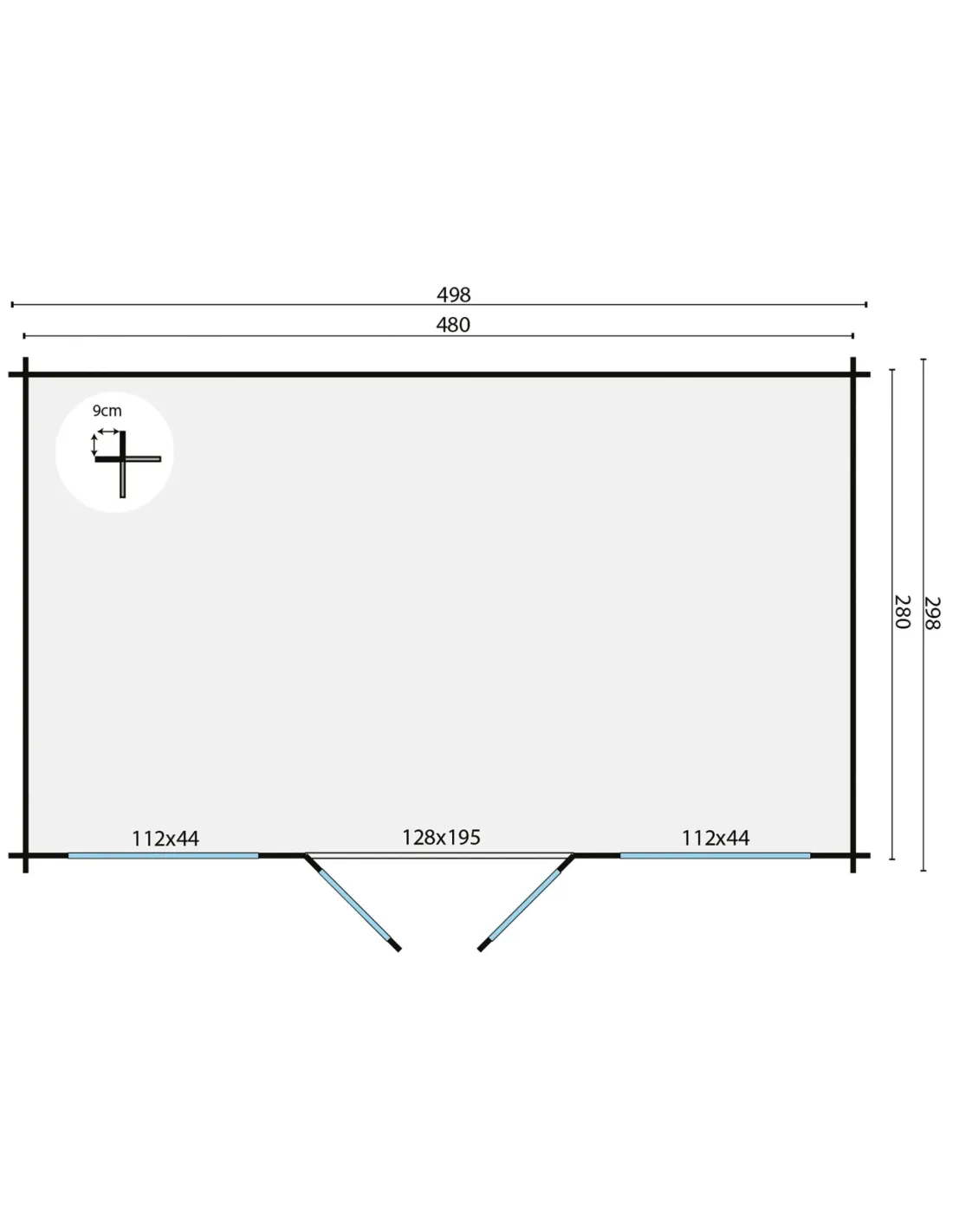 De belangrijkste afmetingen zijn een lengte van 498 cm, een breedte van 298 cm, en een nokhoogte van 225 cm, wat een vloeroppervlakte van 13,4 m² en een interieurvolume van 30,2 m³ biedt.