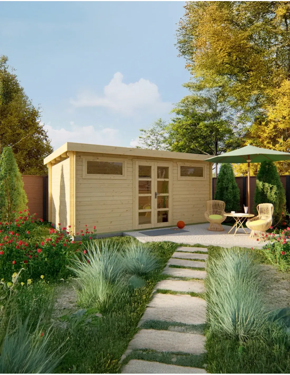 Of u nu een plaats zoekt om uw tuingereedschap op te bergen, een werkplek voor uw doe-het-zelf projecten, of gewoon een rustige toevluchtsoord om te ontspannen, dit tuinhuis voldoet aan al uw wensen. Met een royale vloeroppervlakte van 13,4 m² en een comfortabele nokhoogte van 225 cm, heeft u een interieurvolume van 30,2 m³ om uw creativiteit de vrije loop te laten.