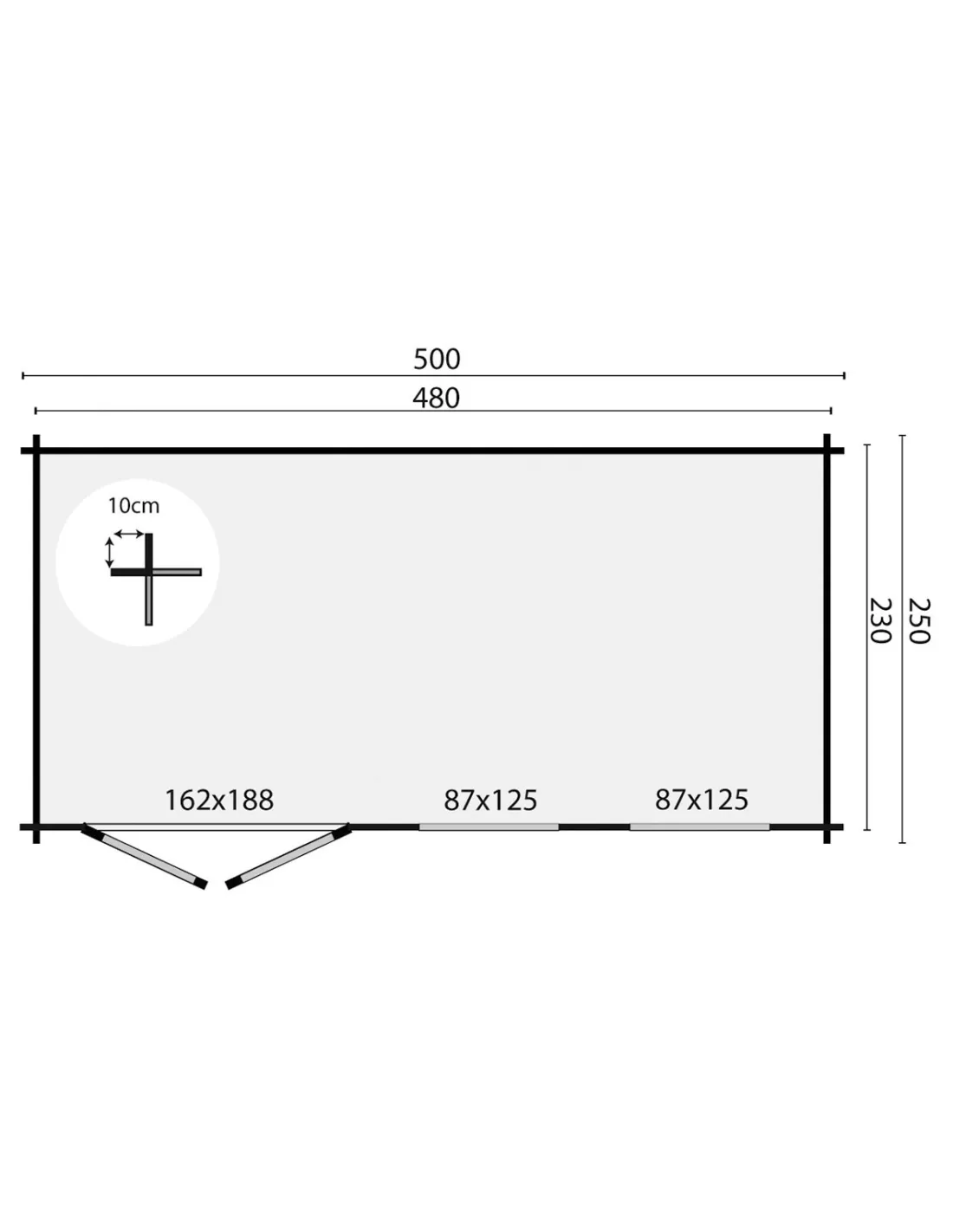 Buitenafmetingen: Breedte 5,00 m x Diepte 2,50 m