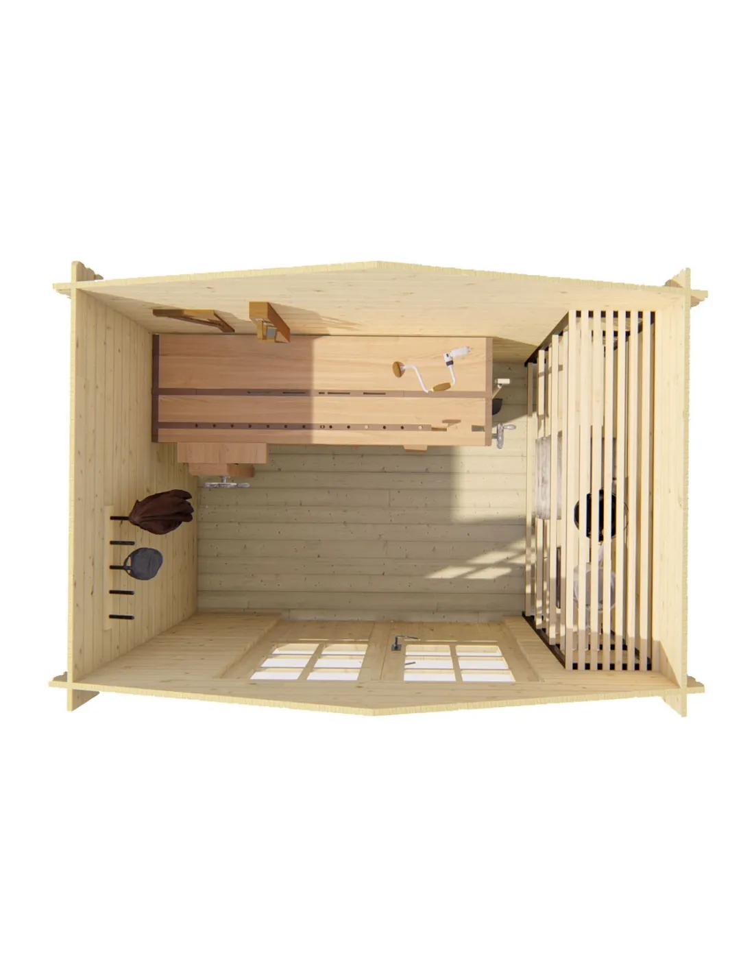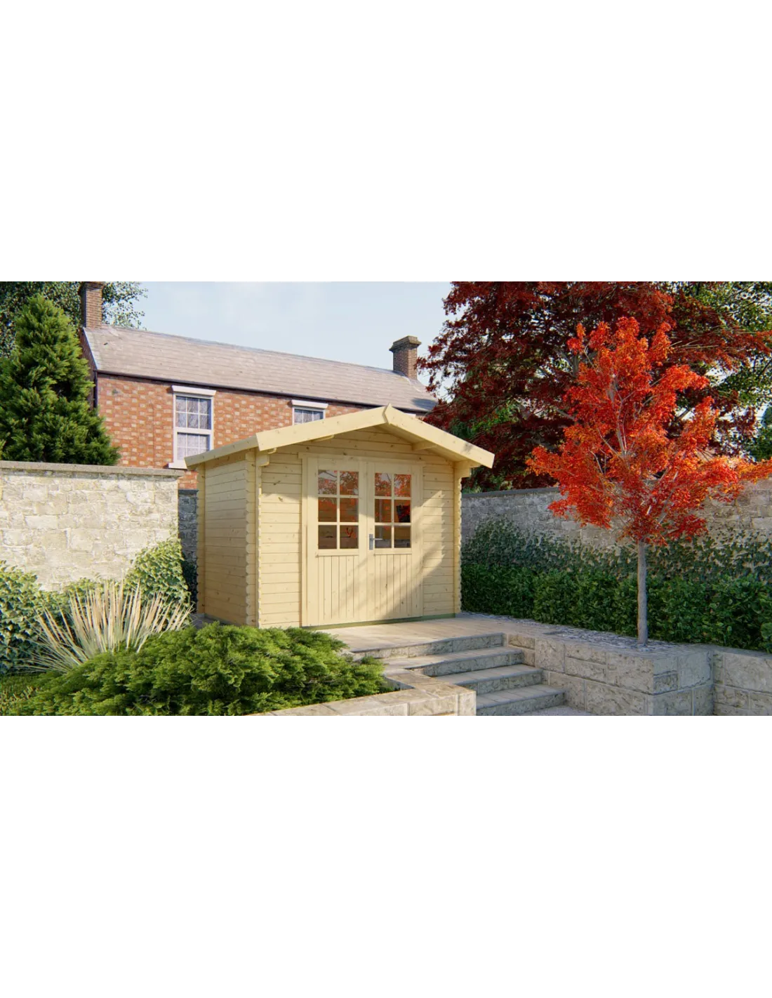 Dit tuinhuis is ideaal als opslagruimte of kleine werkplaats. De dubbele glazen deur vergemakkelijkt de toegang en laat natuurlijk licht binnen. Het sparrenhout zorgt voor een mooie natuurlijke afwerking en biedt een lange levensduur, vooral in de behandelde versie.