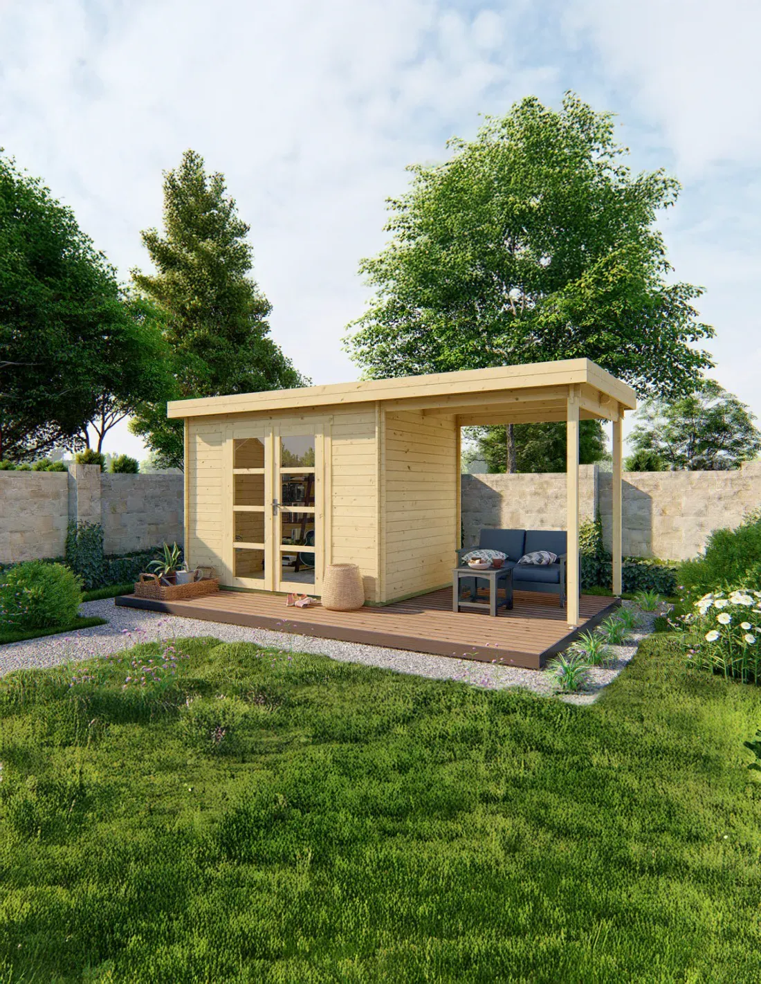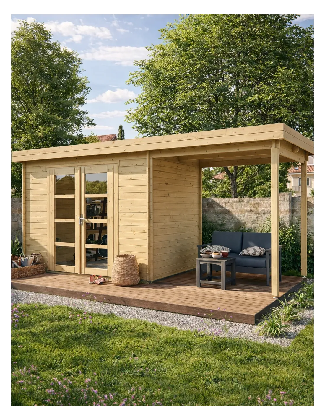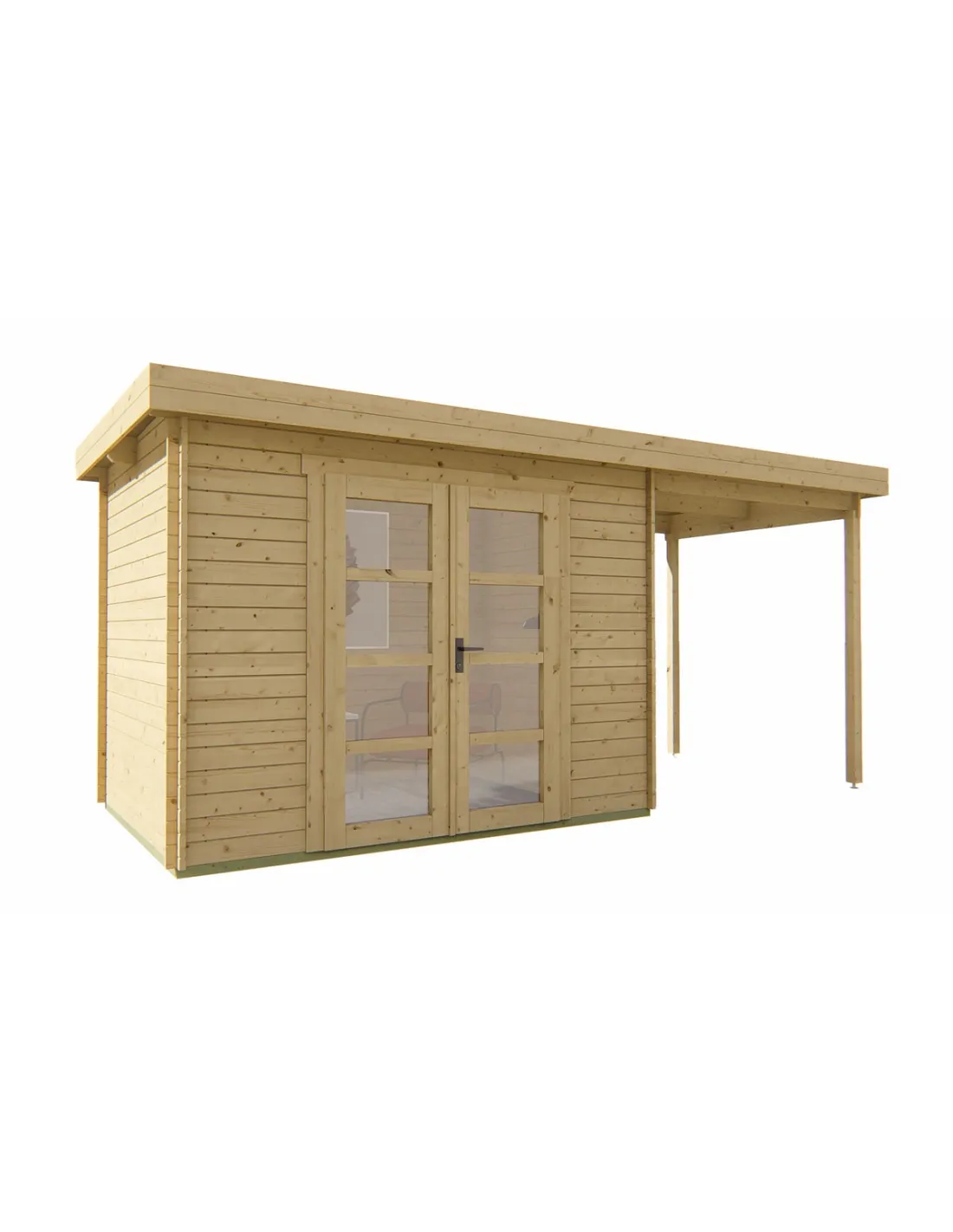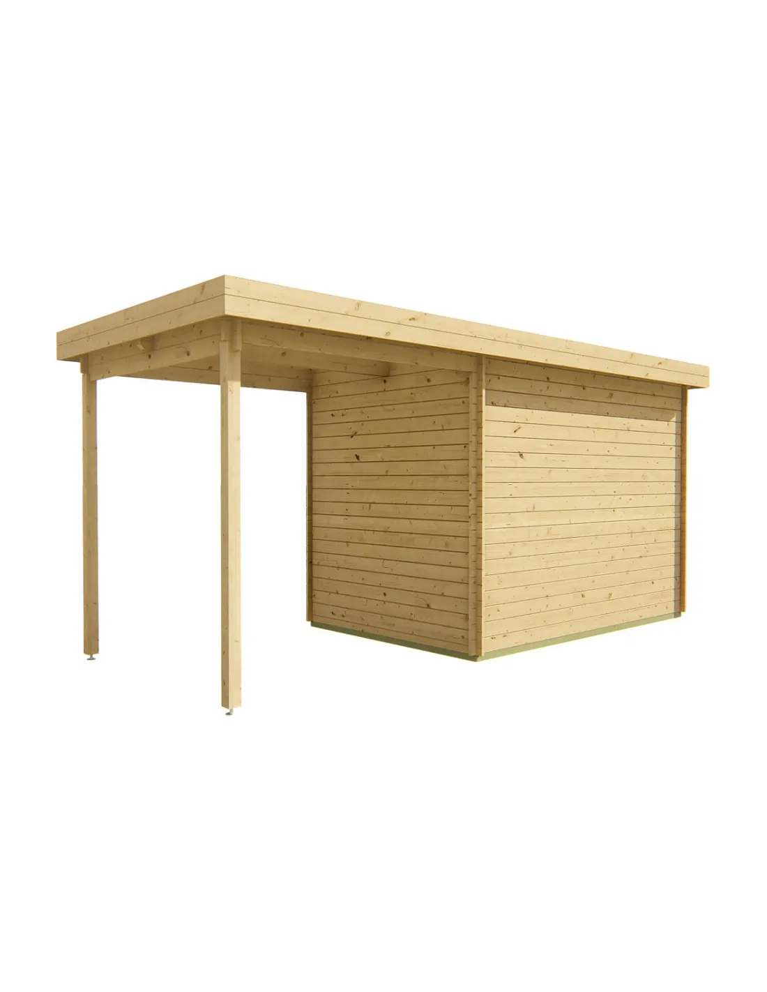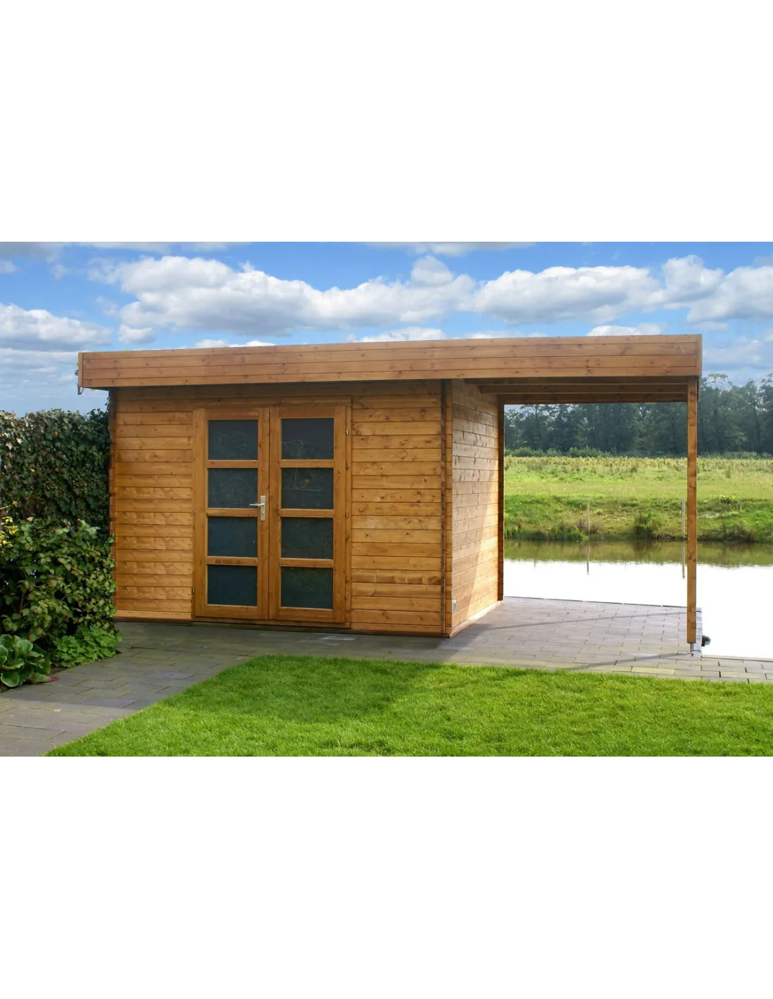 Kies voor een modern tuinhuis met plat dak en een zijwaartse overkapping aan de rechterkant. Perfect om uw gereedschap, fietsen of tuinmeubelen op te bergen en tegelijkertijd te genieten van een extra overdekte ruimte. Dit model combineert functionaliteit en eigentijds design.