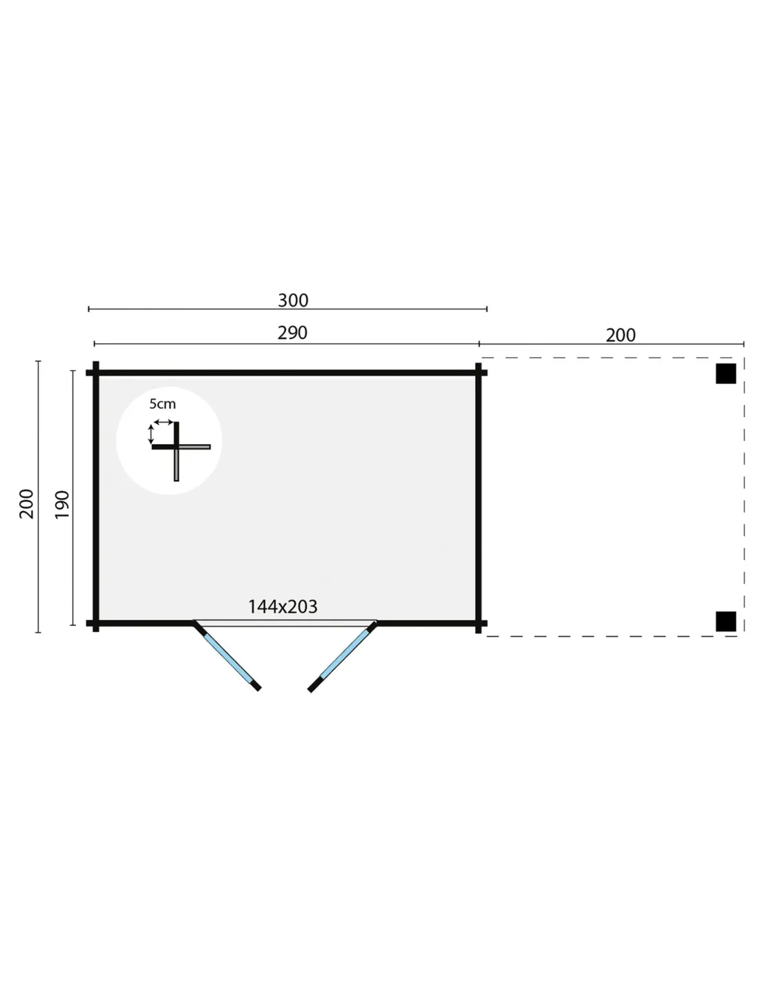 Totale afmetingen (tuinhuis + overkapping): 490 x 200 cm.