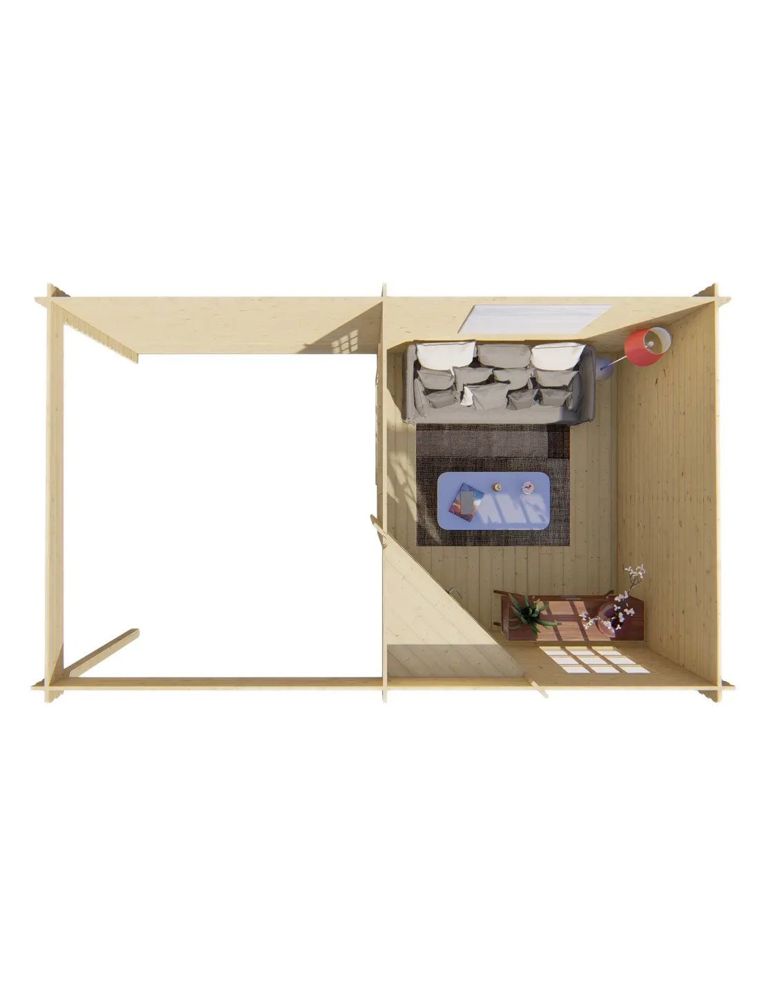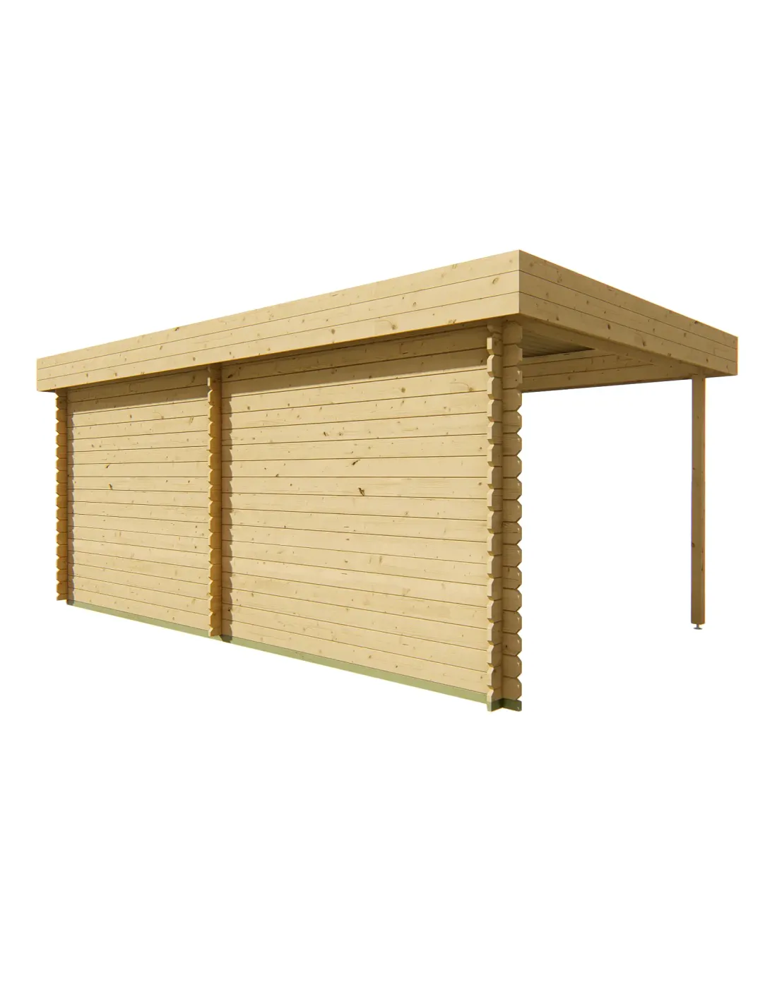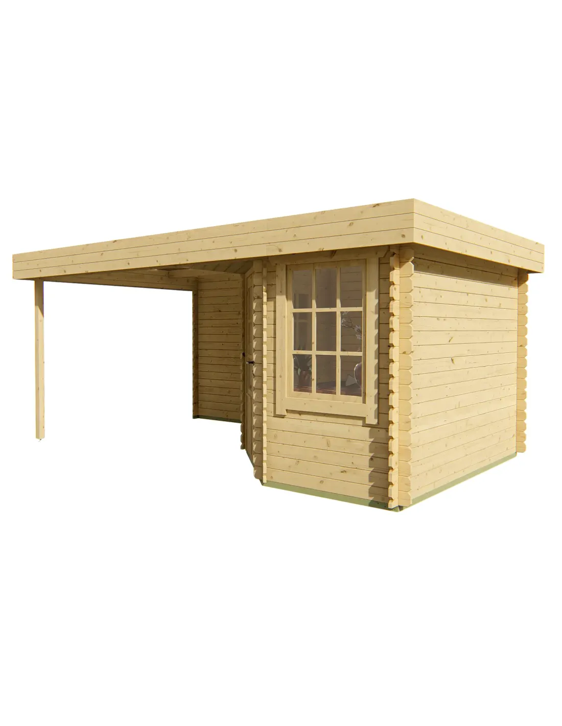 Ontdek ons prachtige tuinhuis met plat dak voorzien van een zijluifel, ideaal om uw buitenruimte te verfraaien. Of u nu een elegante opbergruimte, een doe-het-zelf werkplaats of een beschutte zomerlounge wilt creëren, dit houten tuinhuis voldoet aan al uw wensen dankzij de royale totale oppervlakte van 12,8 m².