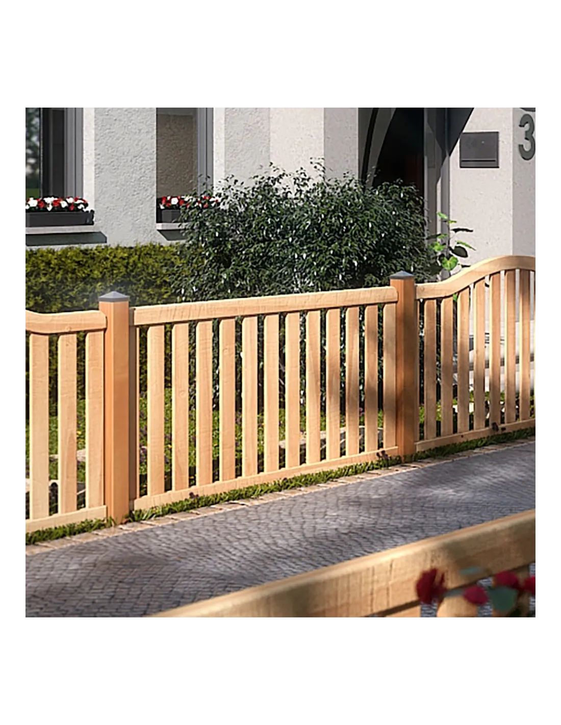 Deze lage schutting is gemaakt van duurzaam exotisch hout, voorzien van een FSC®-certificering om verantwoord bosbeheer te bevorderen. Het heeft een strategische opening in de onderste dwarsbalk, wat zorgt voor optimale waterafvoer. De oppervlakken van deze serie zijn fijn geschaafd voor een gladde textuur, terwijl de randen zorgvuldig zijn afgerond voor een zachte afwerking.