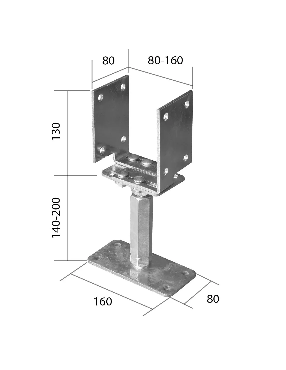 Verstelbare paalvoet in hoogte en breedte voor palen van 71 tot 161 mm.