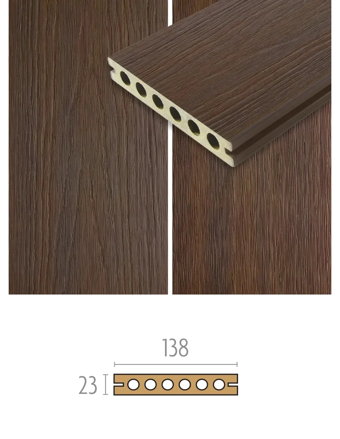 Afkomstig van China zijn deze latten in synthetisch hout, glad en meten 138x23mm. De samengestelde planken zijn verkrijgbaar in twee kleuren: bruin of asgrijs. Ze fixeren zich aan balken met de clips Cobra.
