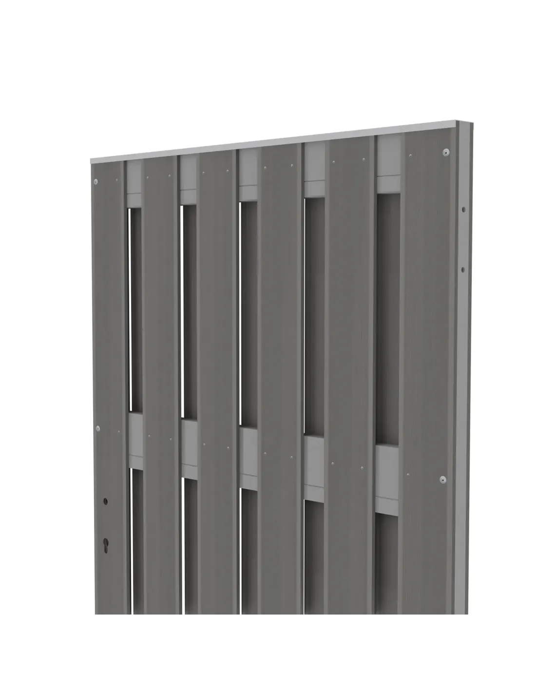 Verticale Profielen: Gegroefd composiethout, 10 x 115 mm, overlappend, vastgezet met dubbele roestvrijstalen schroeven.