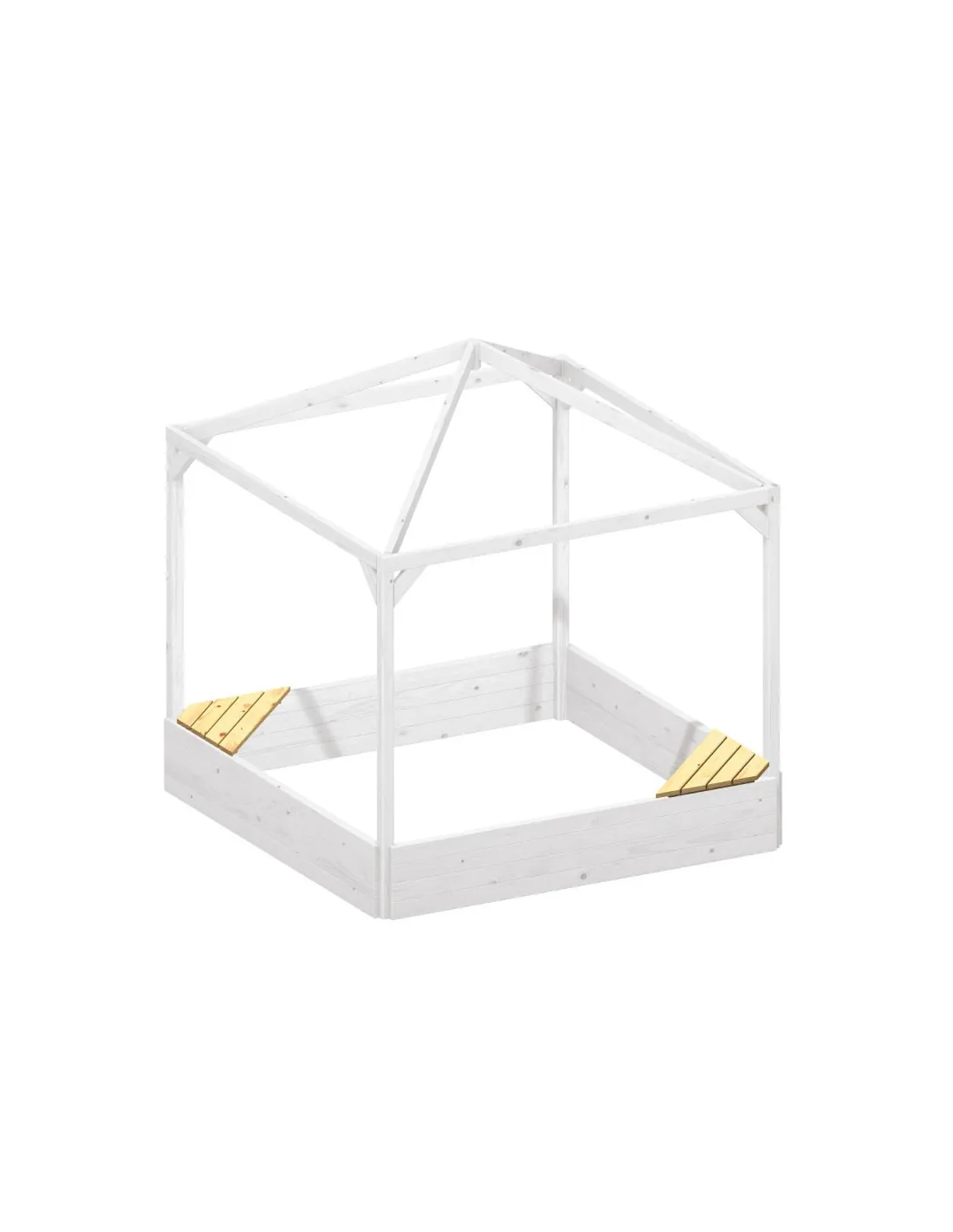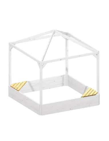 De zithoek in FSC®-gecertificeerd naaldhout past in elk van de vier hoeken van de zandbak.